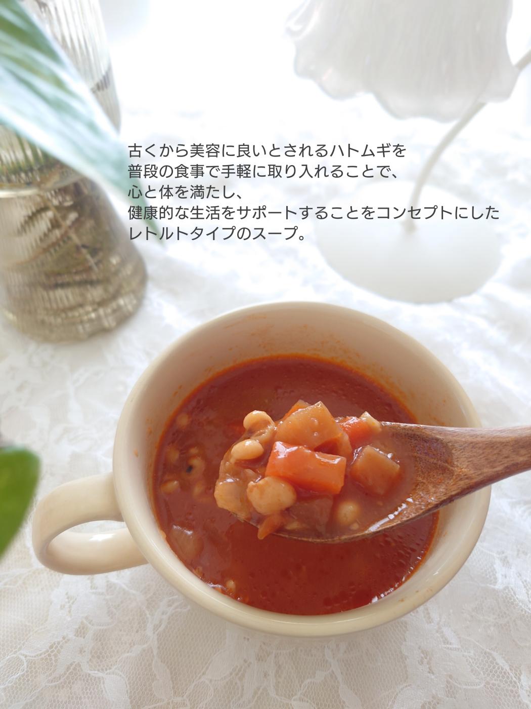 トマトの程よい酸味と人参、セロリ、玉葱をたっぷり使用し、ハトムギ入りで食べ応えのある具沢山スープ。