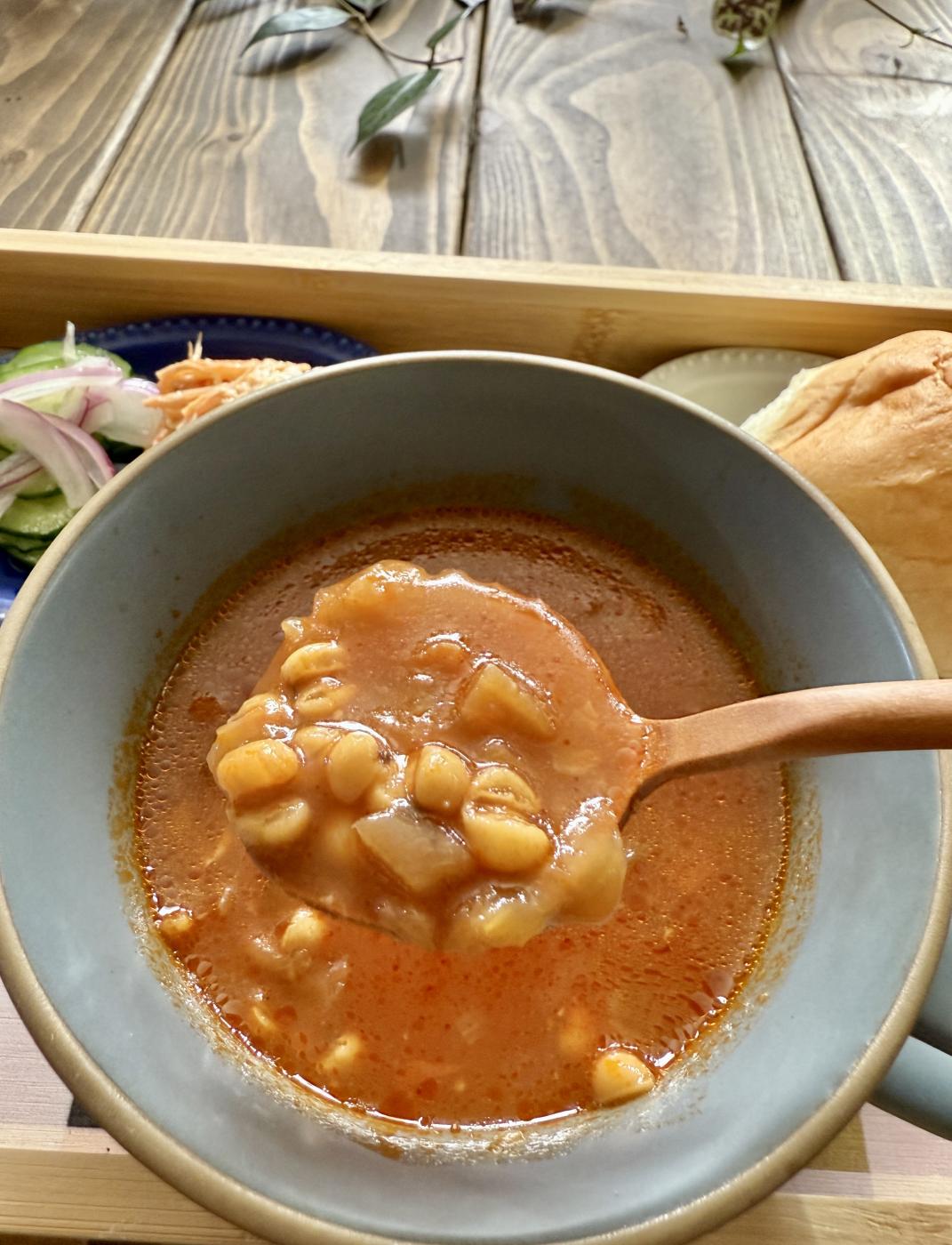・韓国風ピリ辛スープはチュモッパと一緒に。ひよこ豆も入っててちょっと辛くて食欲が出る