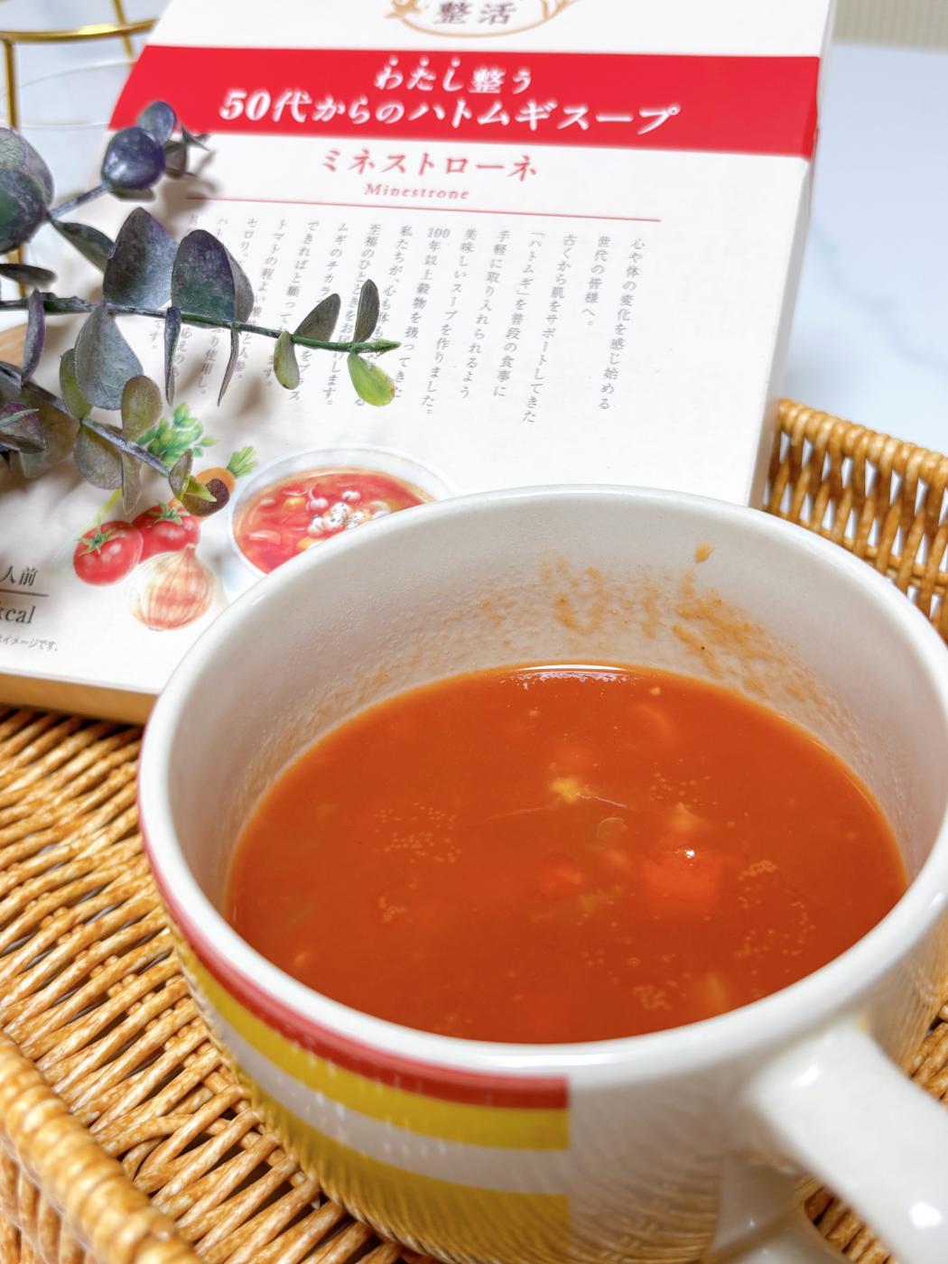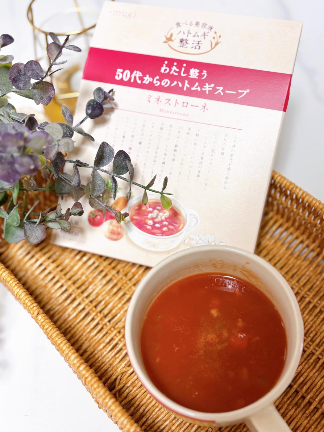 +mugiさんの【食べる美容液】わたし整う50代からのハトムギスープをミネストローネで試してみましたが、想像以上においしくて大満足でした。まず一口食べて驚いたのが、“ハトムギ入りでも全然重くない”こと。ミネストローネらしい野菜の旨みがしっかりあって、そこにハトムギのプチッとした食感が加わることで、満足感がぐっとアップします。スープなのに「ちゃんと食べた感」があるので、忙しい日のランチにぴったりでした。