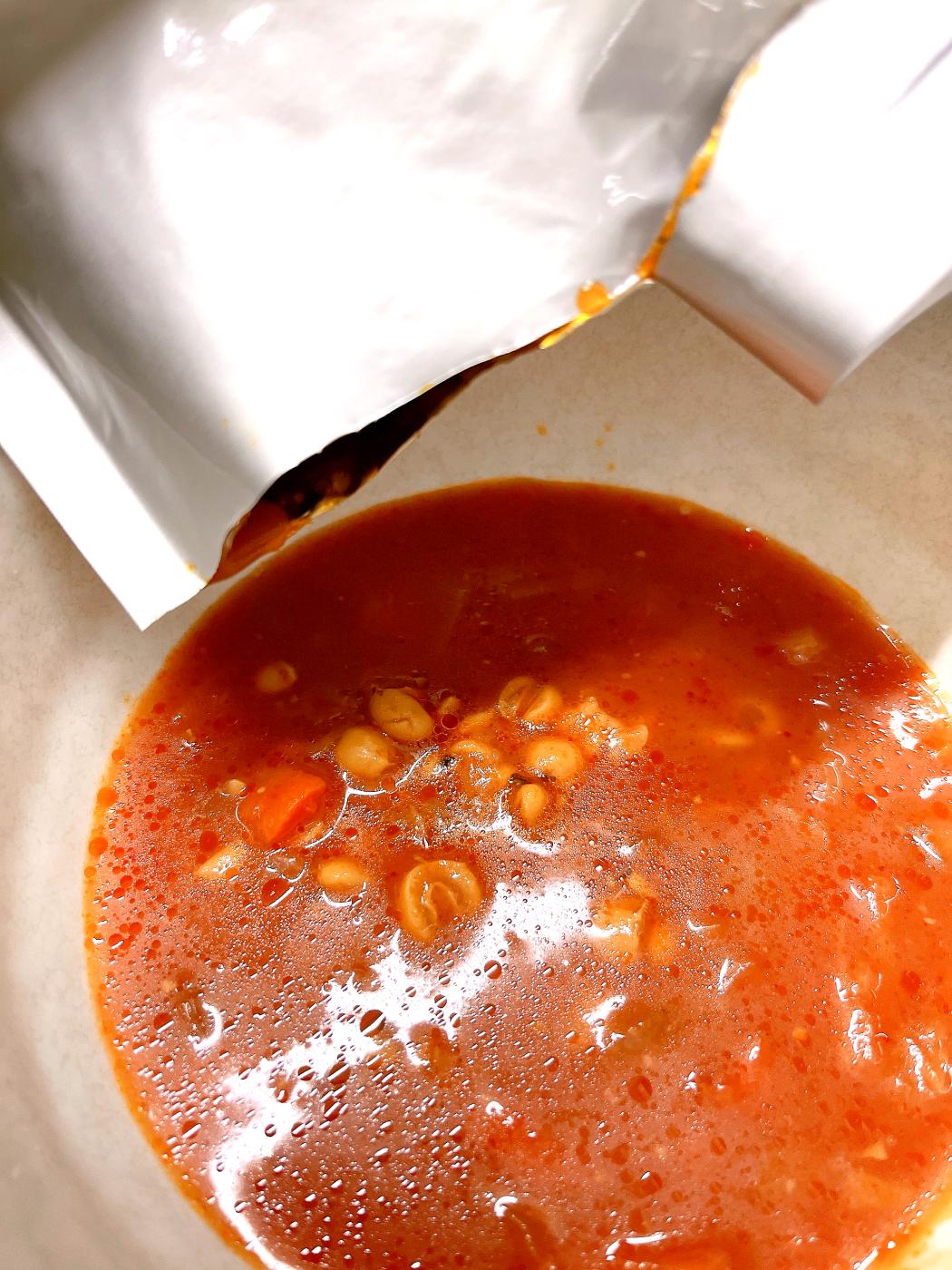 コチュジャンの風味で食欲をそそるピリ辛な味わい。結構しっかりとした辛さがありますが、ひよこ豆の甘さがいい感じに辛さを和らげてくれて1口、また1口と手が止まらなくなるスープでした。ひよこ豆とハトムギがごろごろ入っているのでとても食べごたえがありました!