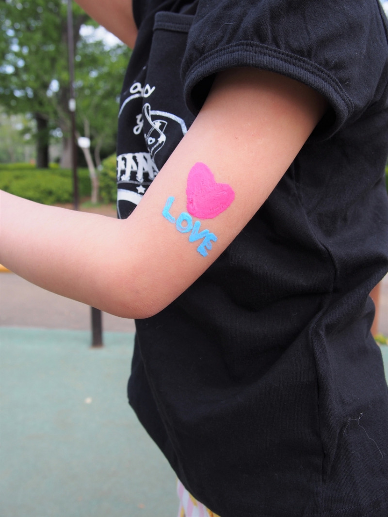 大きめのハート、且つしっかりと塗ったので、少しだけ乾くのに時間がかかりましたが、ただ待っていれば良いだけなので、娘は腕を台(家にあった高さのちょうど良さそうなテキトウなもの)にのせて、絵本を読んでいました。