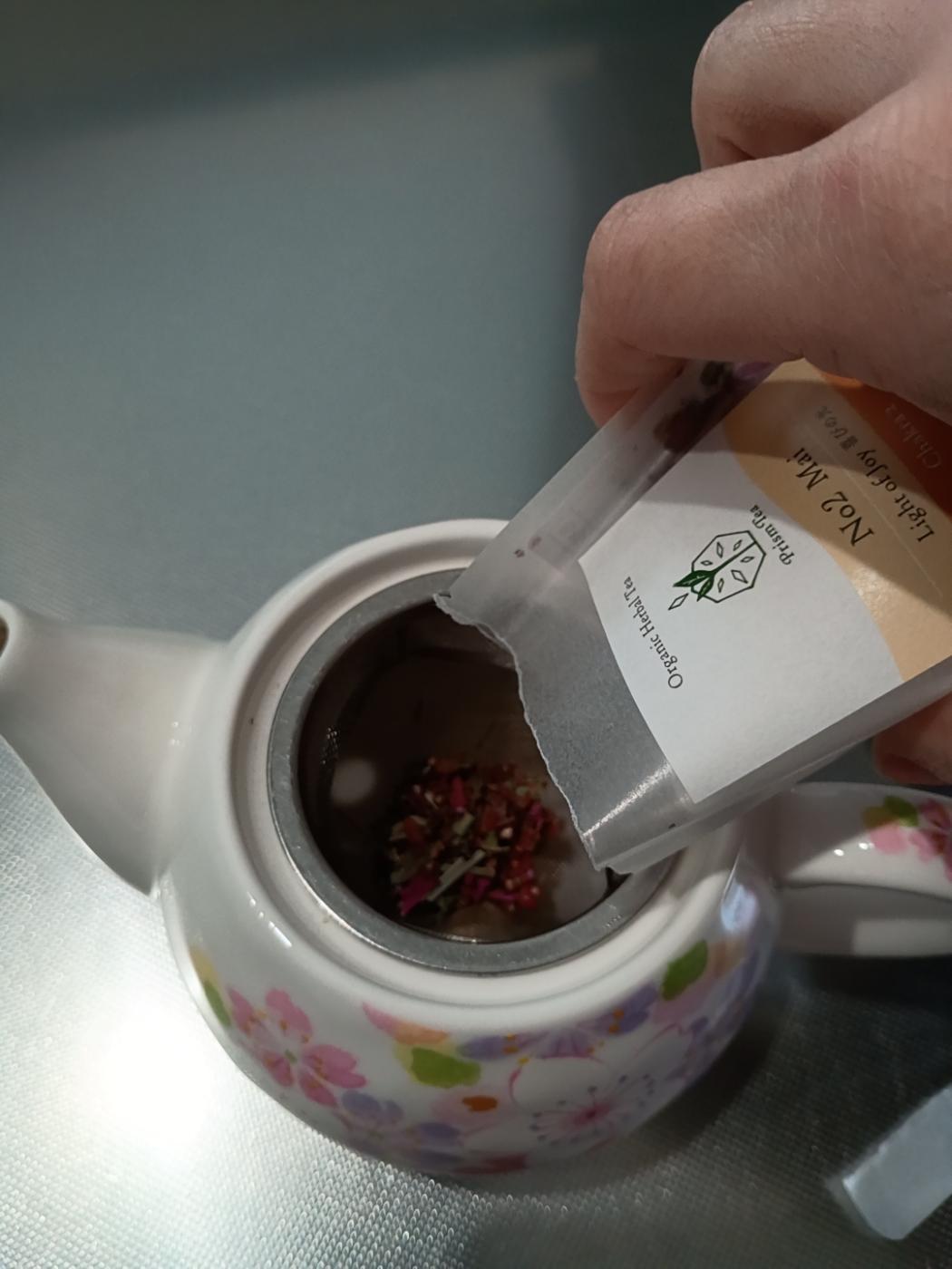袋を開けて、ハーブを急須にさらさらっと入れます