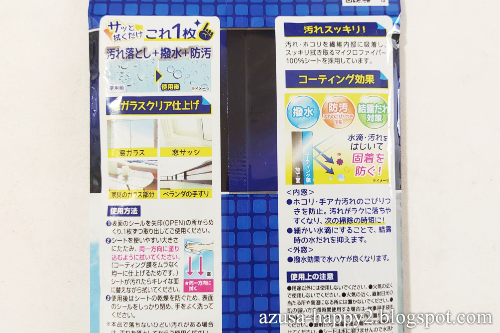 分かりやすいパッケージの通り、汚れを落としてズバッと コーティングしてくれる窓ガラス用のお掃除シートです。