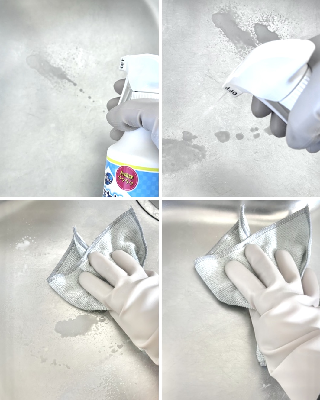 使い方は予め掃除をし水滴を取ったところに『ズバッと 水まわりの防汚コート 』をスプレー(目安量:1㎡あたり8プッシュ程)