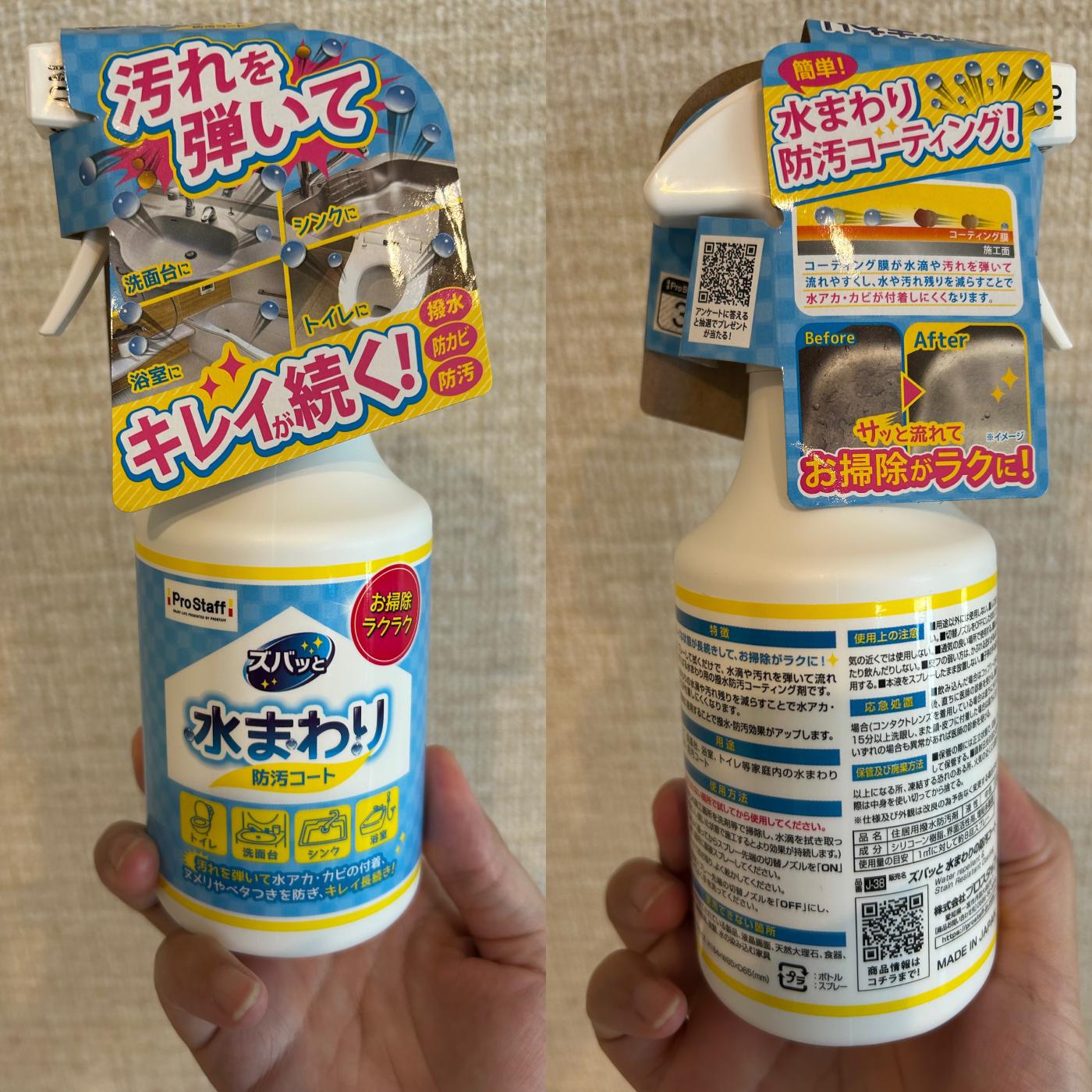 シンク・洗面台・浴室・トイレなどの水まわりにスプレーして拭くだけの簡単お手入れで、水滴や汚れを付きにくくする撥水防汚コーティング剤です😊