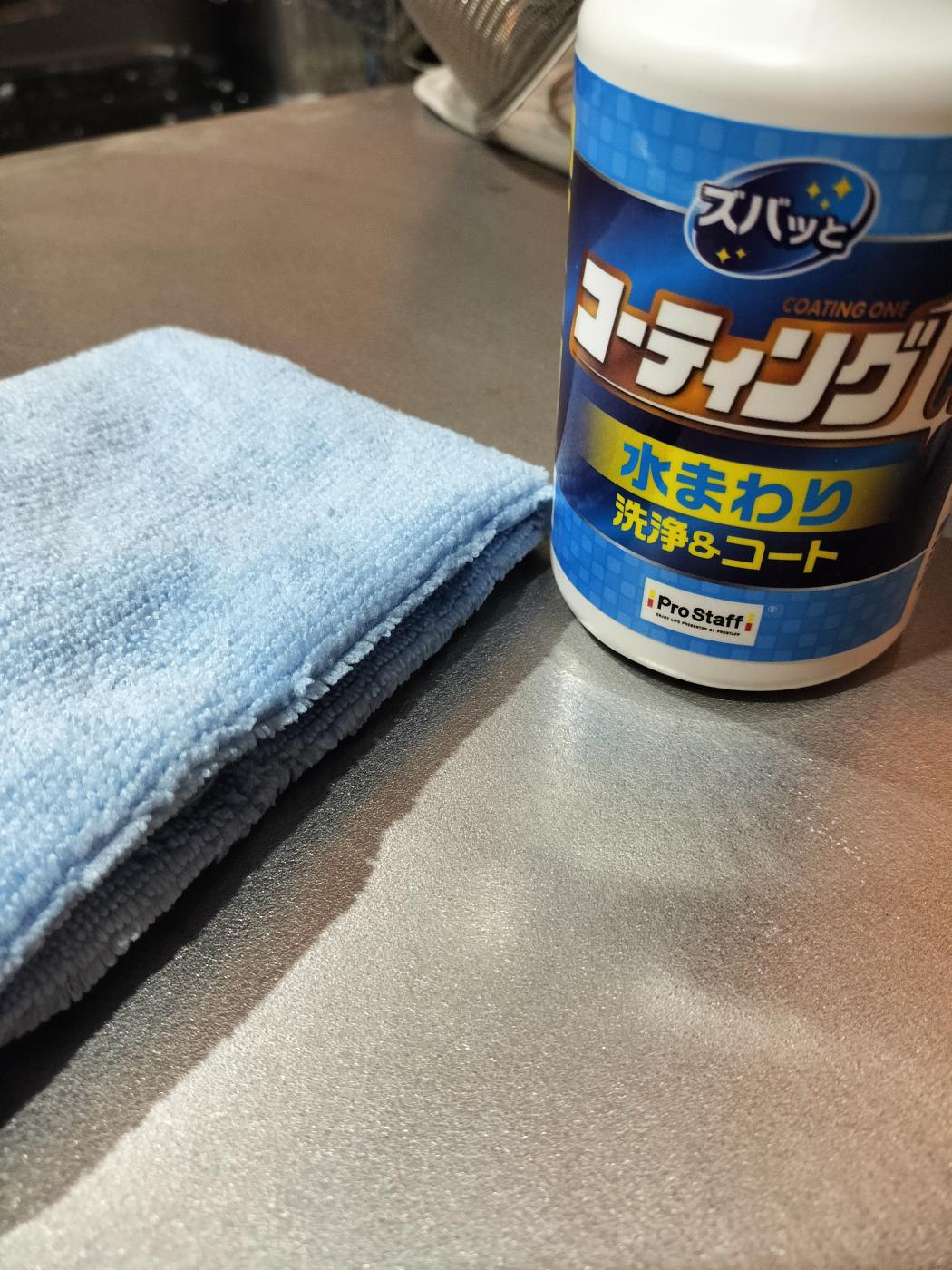 そして付属のクロスで拭き上げました!ムラもなく、綺麗に拭き上げられました!水を垂らしてみたら、しっかりと弾いてくれてとっても感動しました!シンクの汚れを落とした後に、コーティングスプレーをするのが楽しくなりました!汚れもつきにくくなったので、キッチンの掃除が楽になりました!