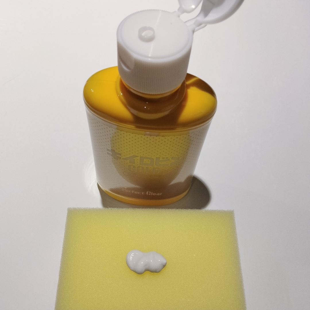 ②容器をよく振って、専用スポンジに少し水を含ませてから キイロビン ゴールド Hを2センチ程度出してこする