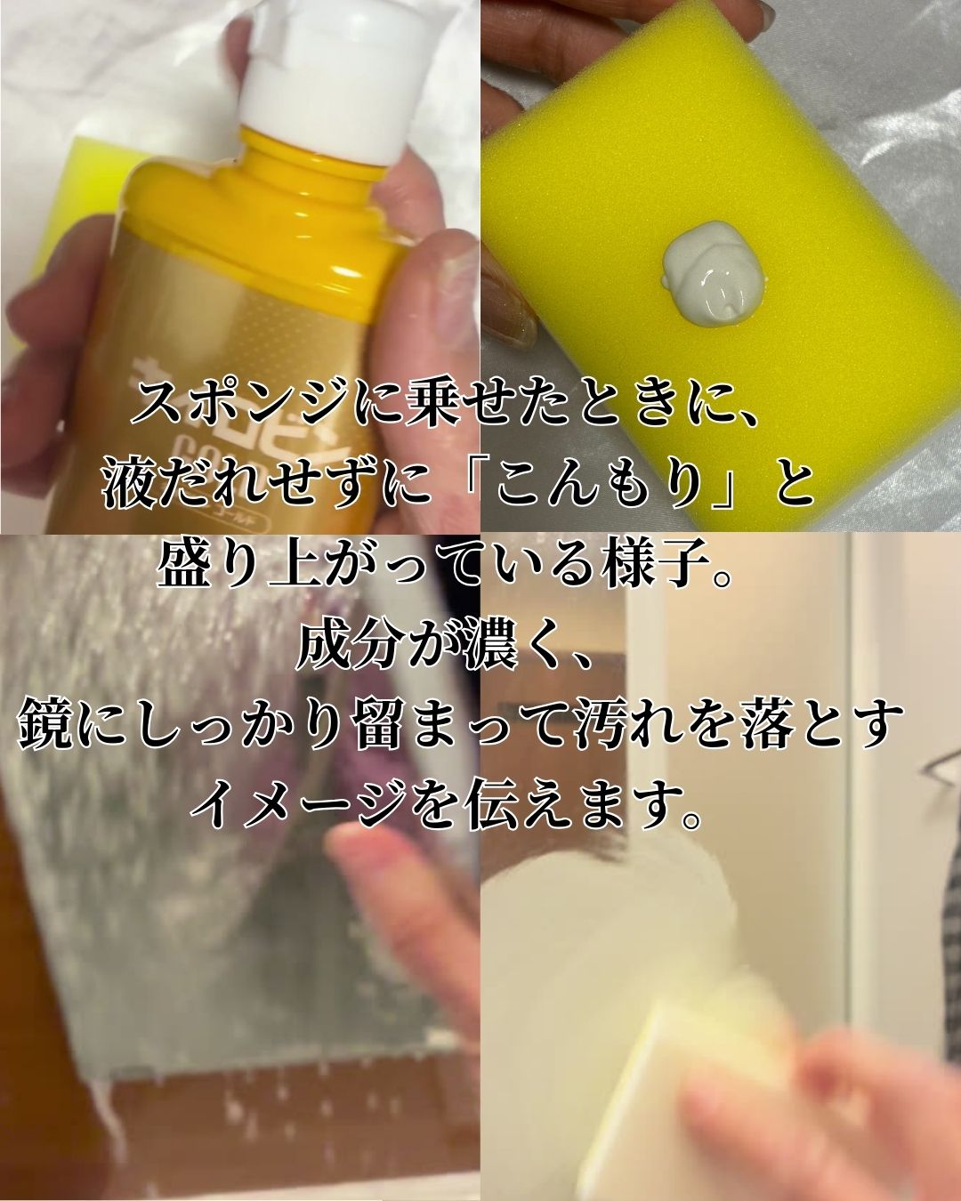 正直、車のガラス用というイメージが強かったのですが、鏡にも使える点に惹かれて試してみました。使い方はシンプルで、付属のスポンジに少量とって鏡全体にやさしく広げるだけ。力を入れてゴシゴシこする必要がなく、くるくると動かしていく感覚でした。作業時間も長くかからず、お風呂掃除の流れで使える手軽さが印象的です。
