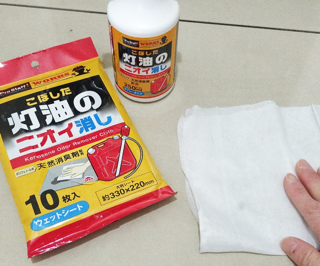 消臭作用の高いポリフェノール系天然消臭剤と、灯油臭を抑え込むマスキング剤(香料)を配合していて、灯油臭に高い消臭効果を発揮するんだそう