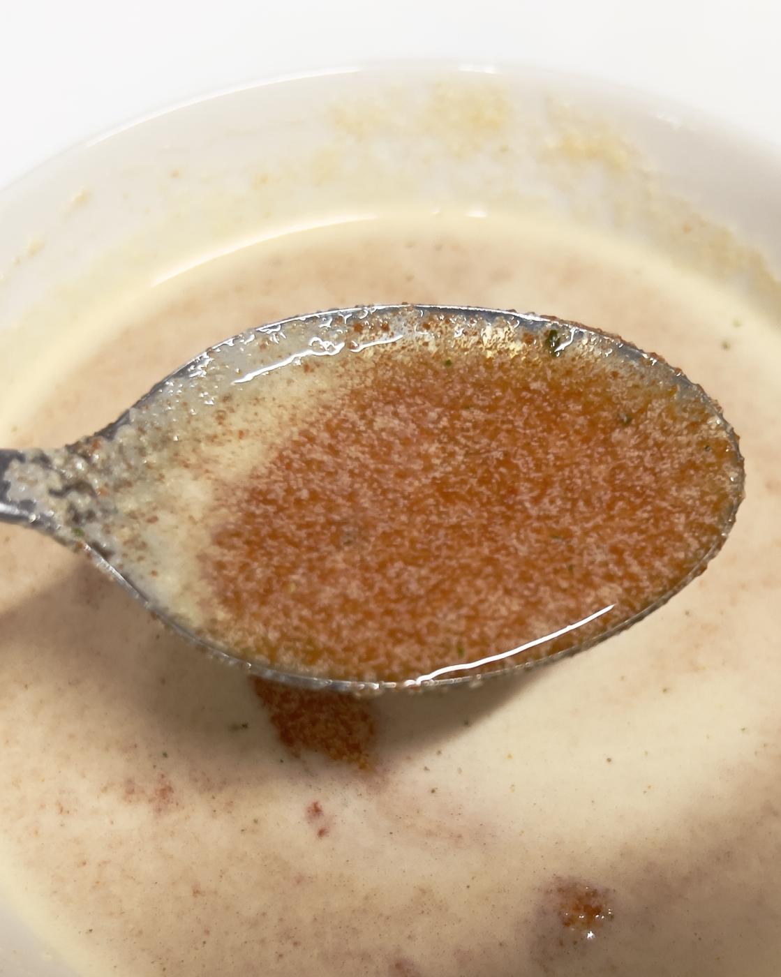 表面は白っぽいトマトスープですが、中のスープはトマトらしい赤色です。