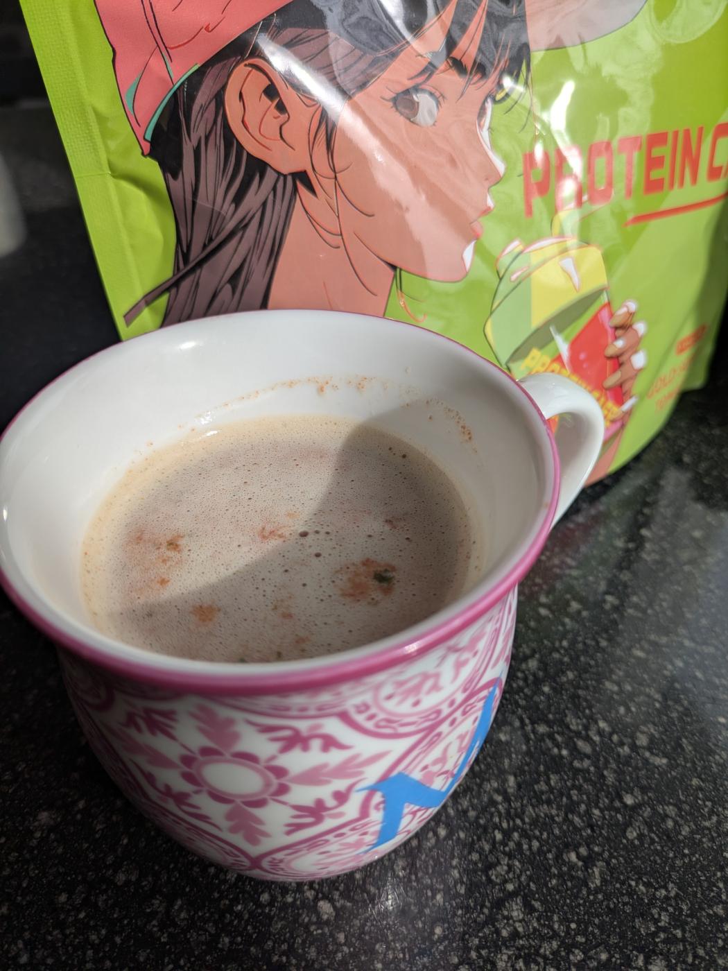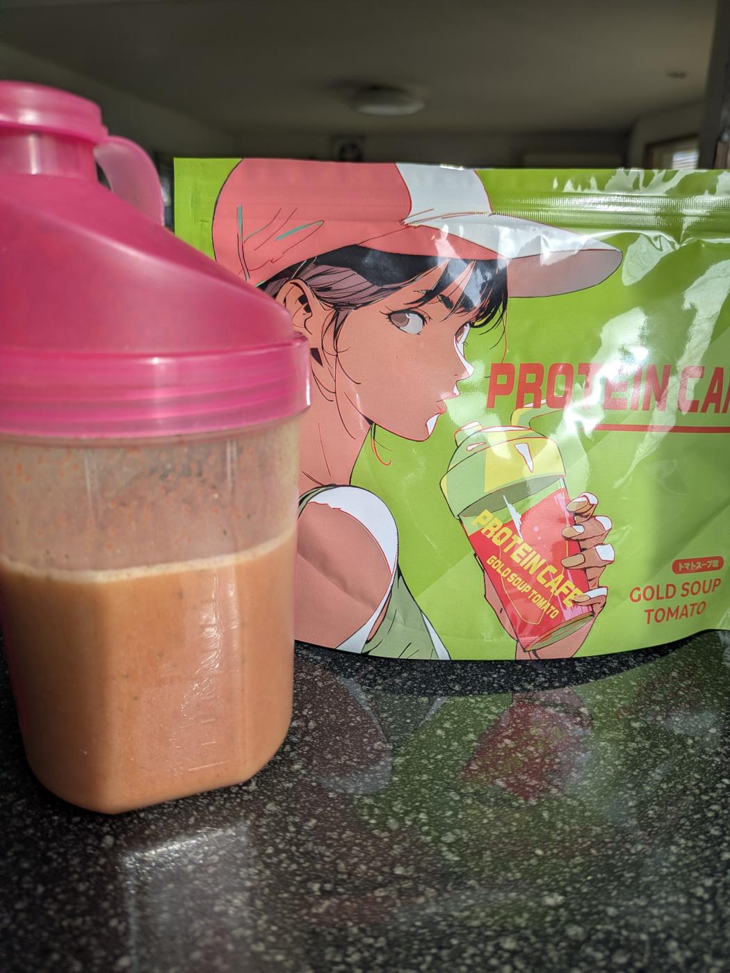 寒い中ウォーキングしてきたので、今回はシェイクしてから電子レンジで温めて飲んでみましたが、プロテイン感は感じられずまさにトマトスープ!身体も温まりました。これなら続けて飲めます。プロテイン特有の粉感も感じないし、水にもすぐ馴染む感じでシェイクもあっという間にできます。