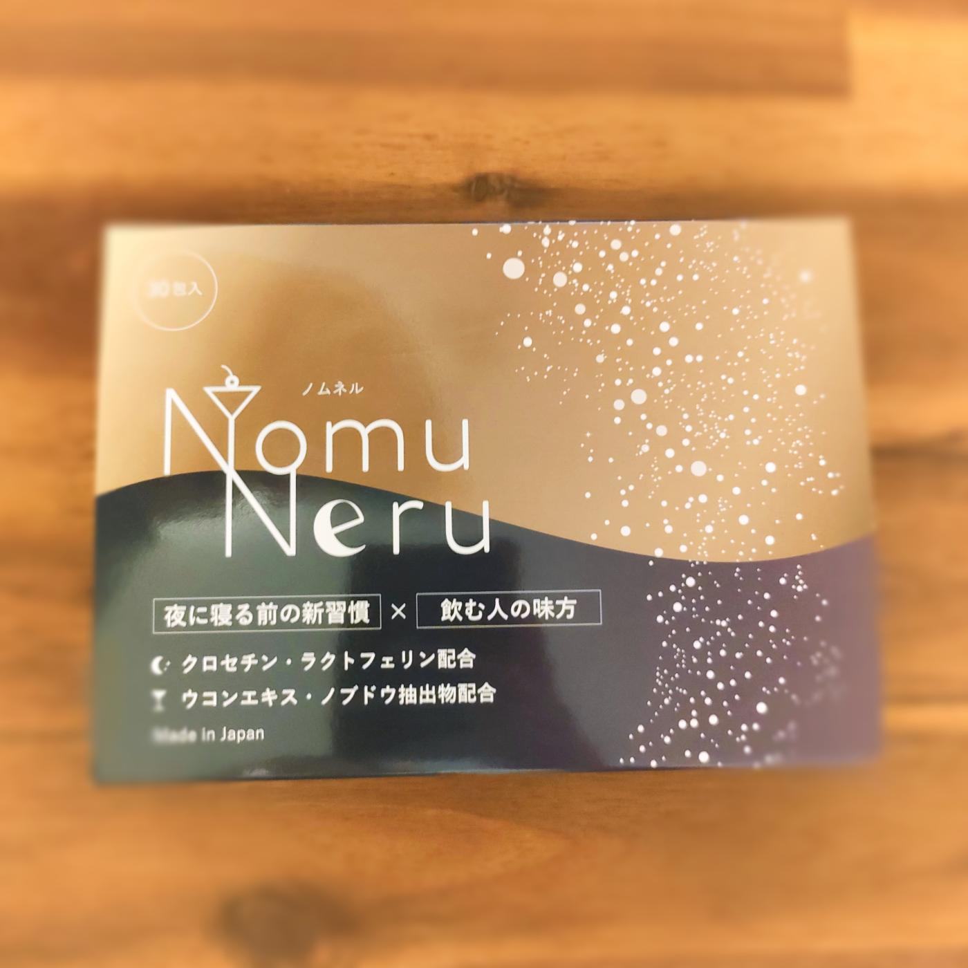 パッケージの箱はゴールドとワインのような紫色の背景に、シャンパンのような泡が描かれており、遊び心がありながらも落ち着いていておしゃれなデザインです。また、商品名のNomuNeruという文字の中にはカクテルと月が隠れており、夜寝る前に飲むことやお酒を飲む人向けというのがわかりやすいと思いました。