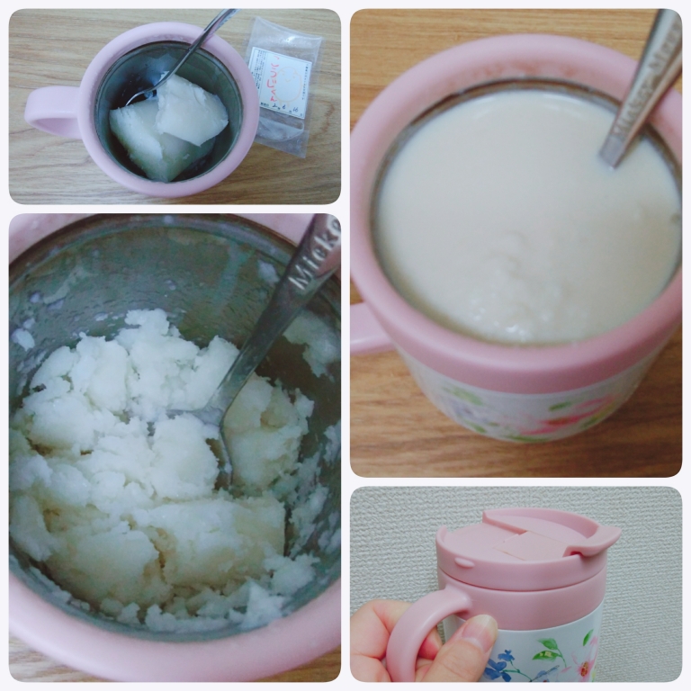 私の飲み方は、凍ったままの糀の生甘酒『こうじくん』を豆乳で割って飲みました。