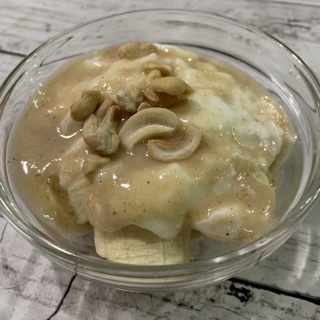 カットしたバナナにプレーンヨーグルトをかけ、その上に「こうじくん」をかけます。