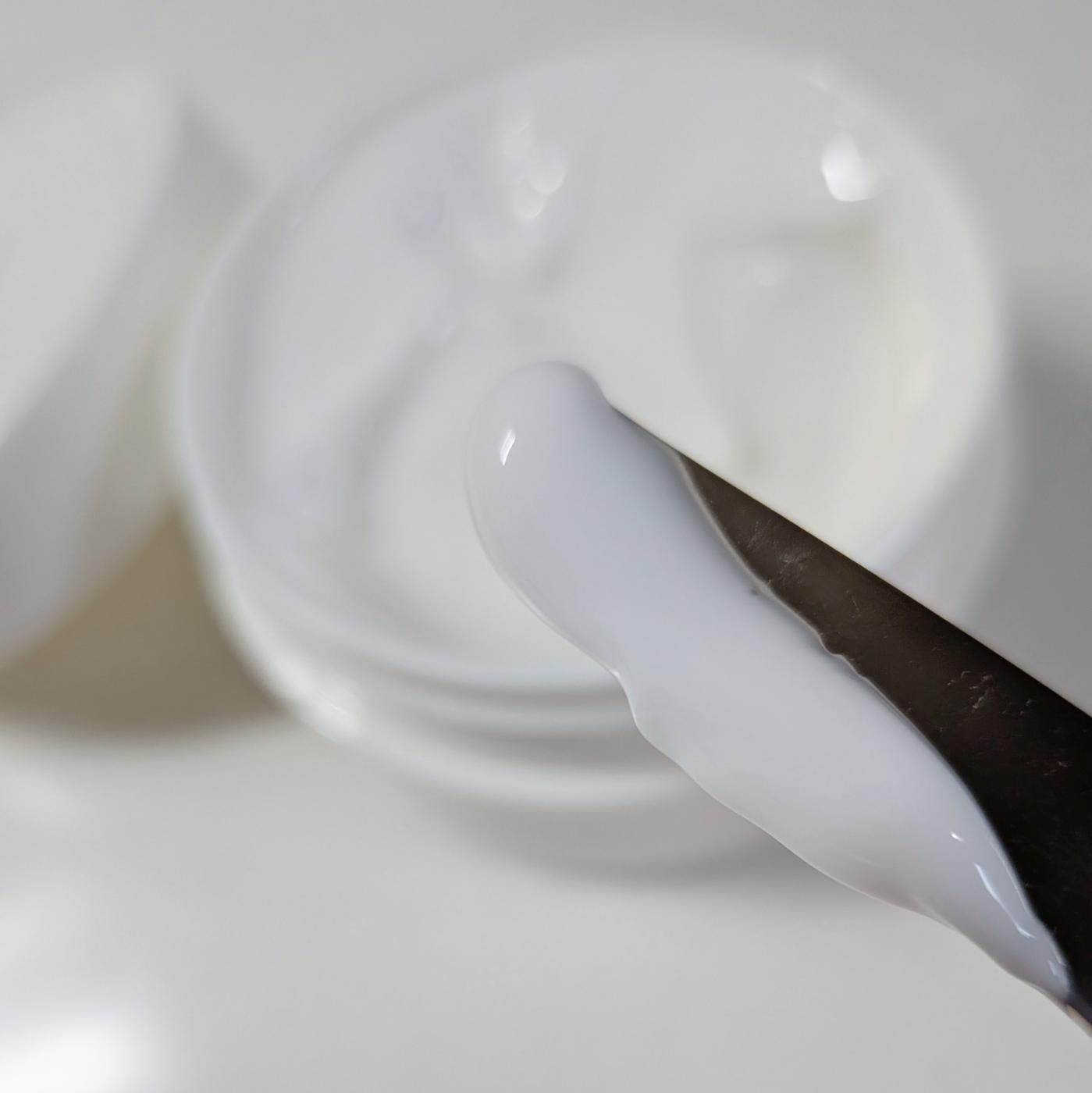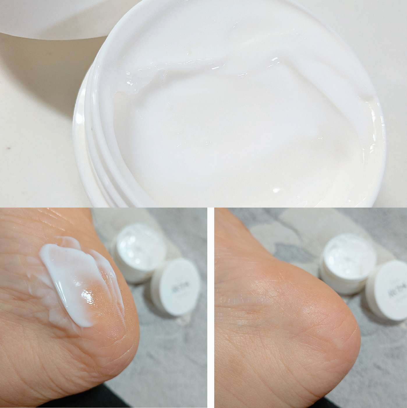 テクスチャはなめらかで、指ですっと伸ばしやすく、少量でもかかと全体に広げやすい印象◎