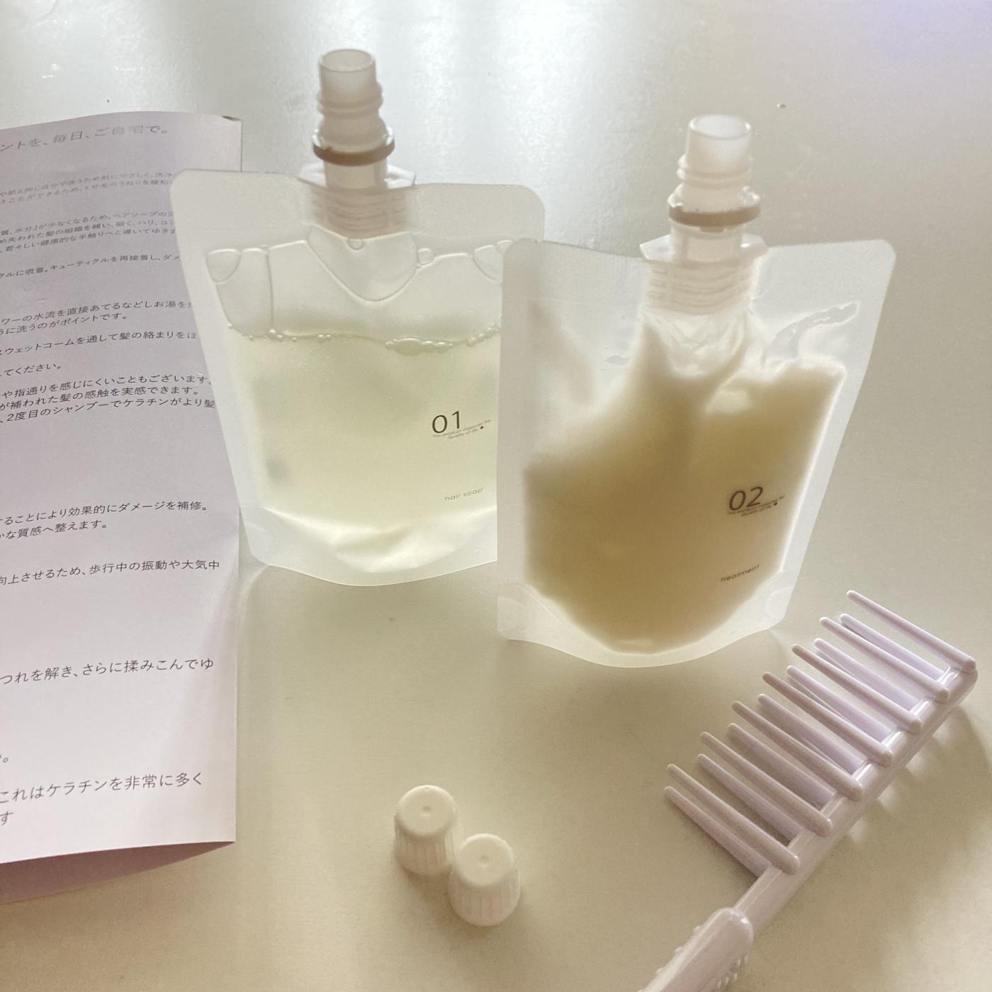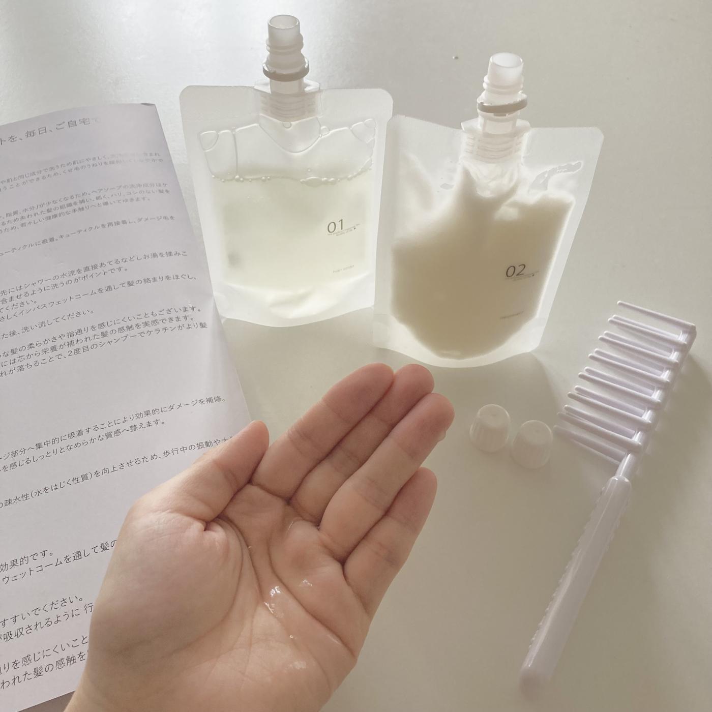 ヘアソープは少しとろみのある感じで泡立ちも良い!専用のコームで髪を解いてマッサージしながら洗って泡のついた状態で2〜3分放置するのがポイントなんだとか!