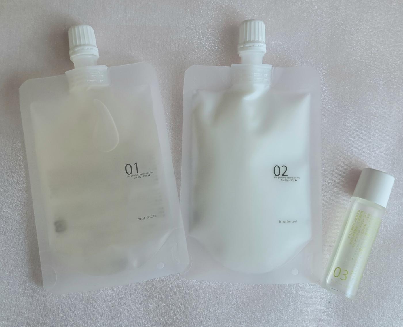 ヘアソープ50mL×トリートメント50g×ヘアオイルサンプル10mLの3点セットです。
