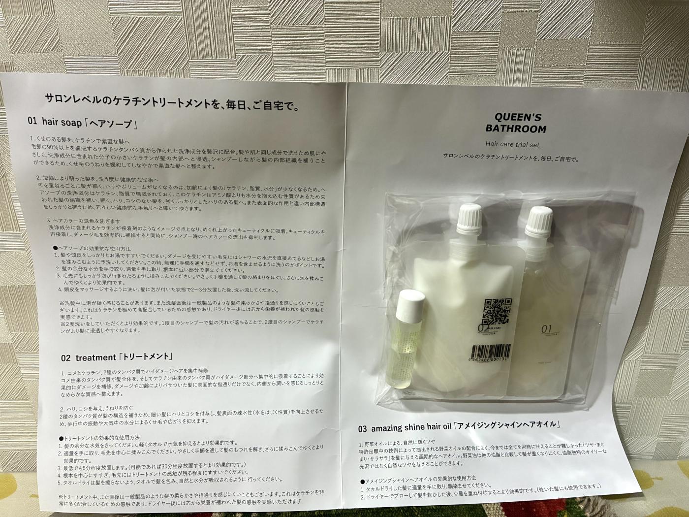 約5回分のパウチに、ヘアソープ、トリートメントを髪へ馴染ませます。オイルも付いていました〜嬉しい☺️