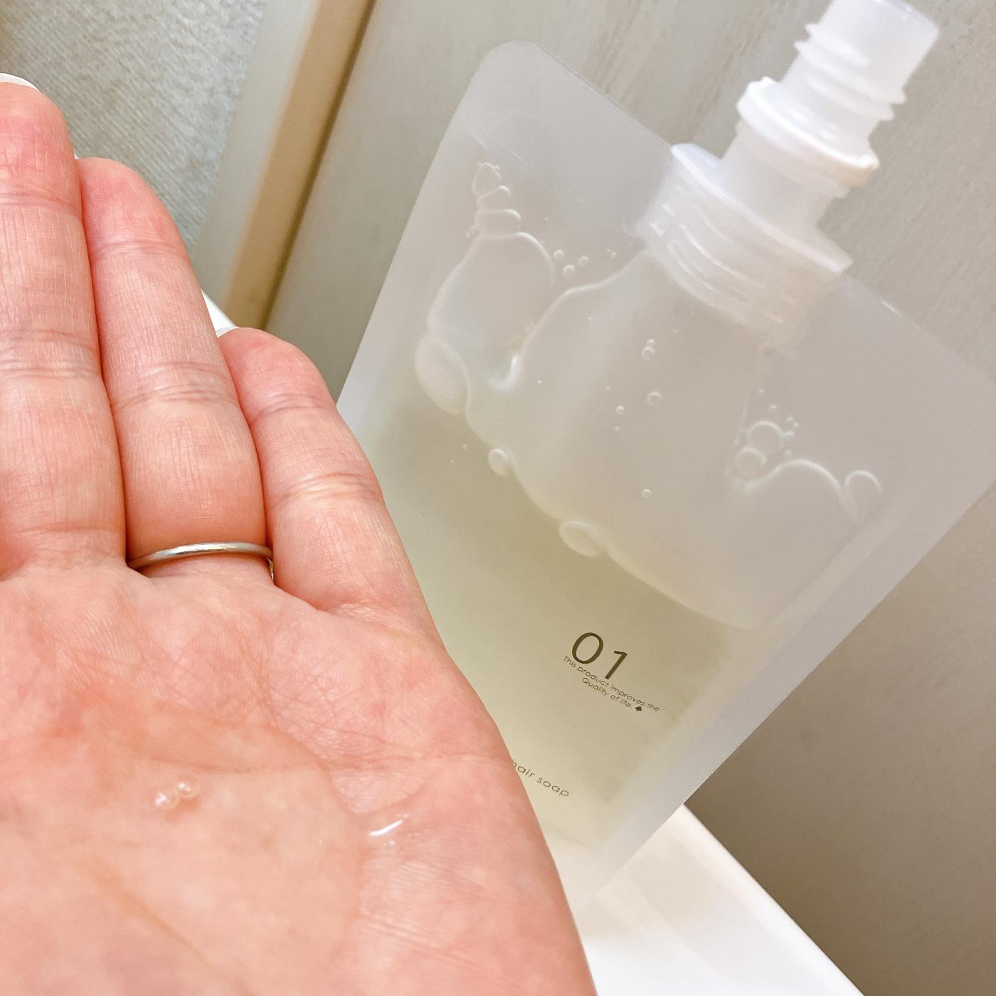 透明のさらりとしたジェルタイプで、少量でも泡立ちがとても良く、髪全体にふわっと広がります。泡がやわらかくて指通りがよく、摩擦を感じにくいので、頭皮にも髪にもやさしい印象🌿