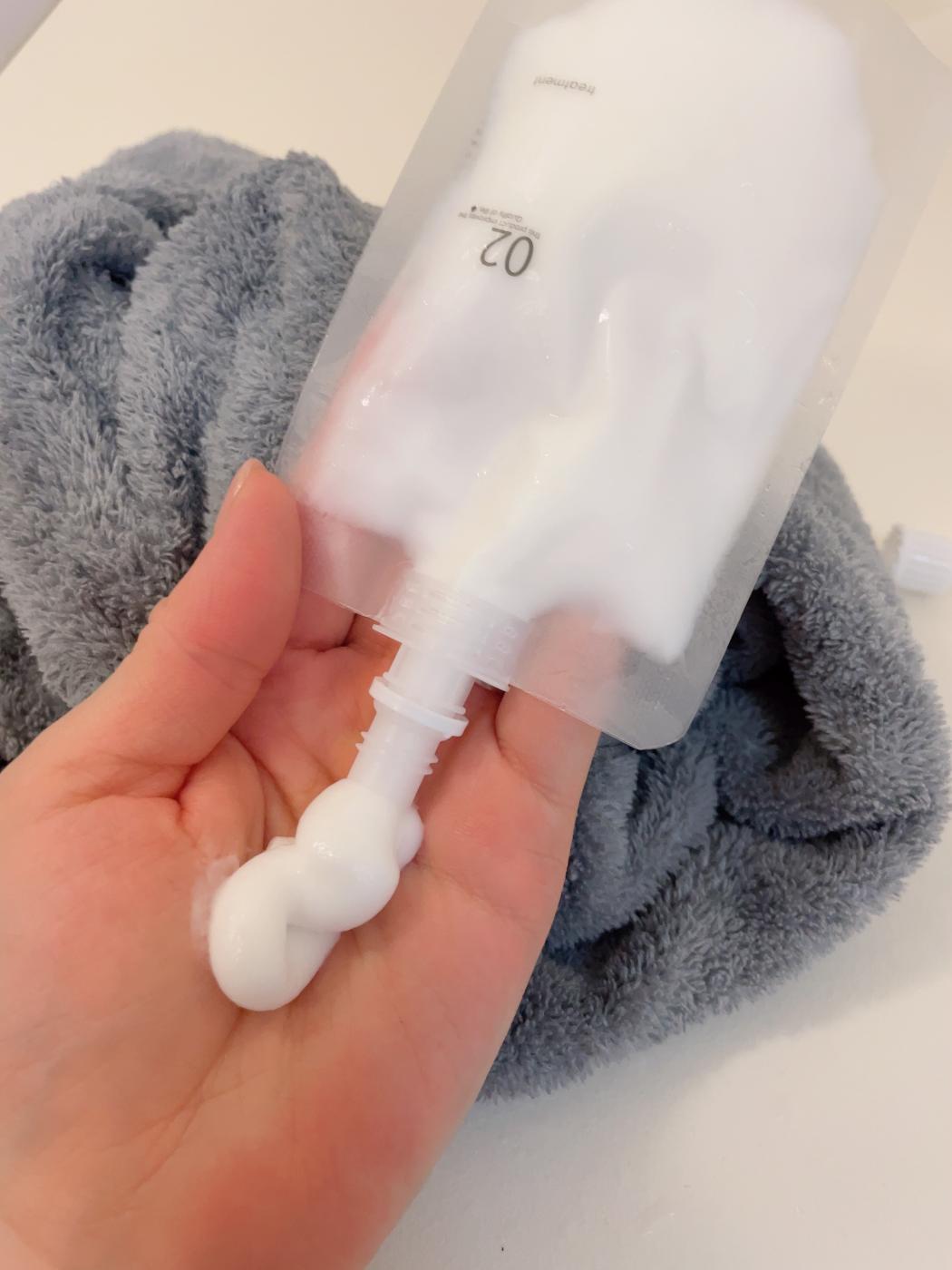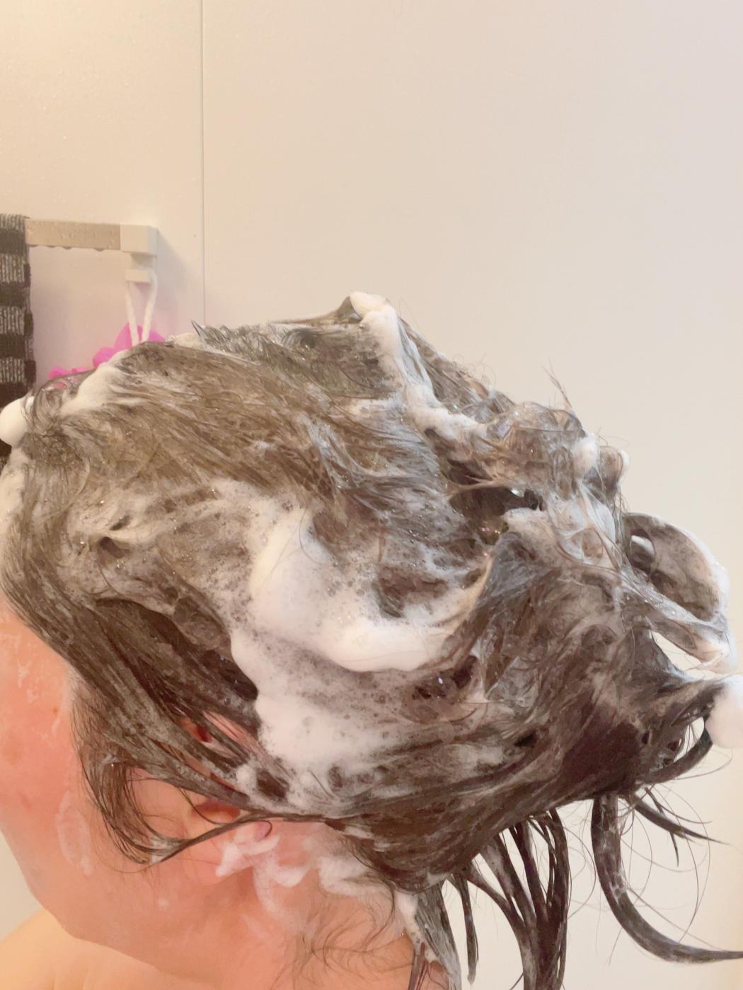 シャンプーはとろっとしたテクスチャーです。たっぷりとお湯で予備洗いをした後、根元部分で泡立てます。最初は泡立ちにくかったけれど、二度洗い目にはモコモコ泡ができました。まるで泡立てネットで泡立てたみたいです。洗い流すと指通りが悪くキシむ感じがしました。が、これは ケラチンが高配合されている証拠。そのままトリートメントに移ります。
