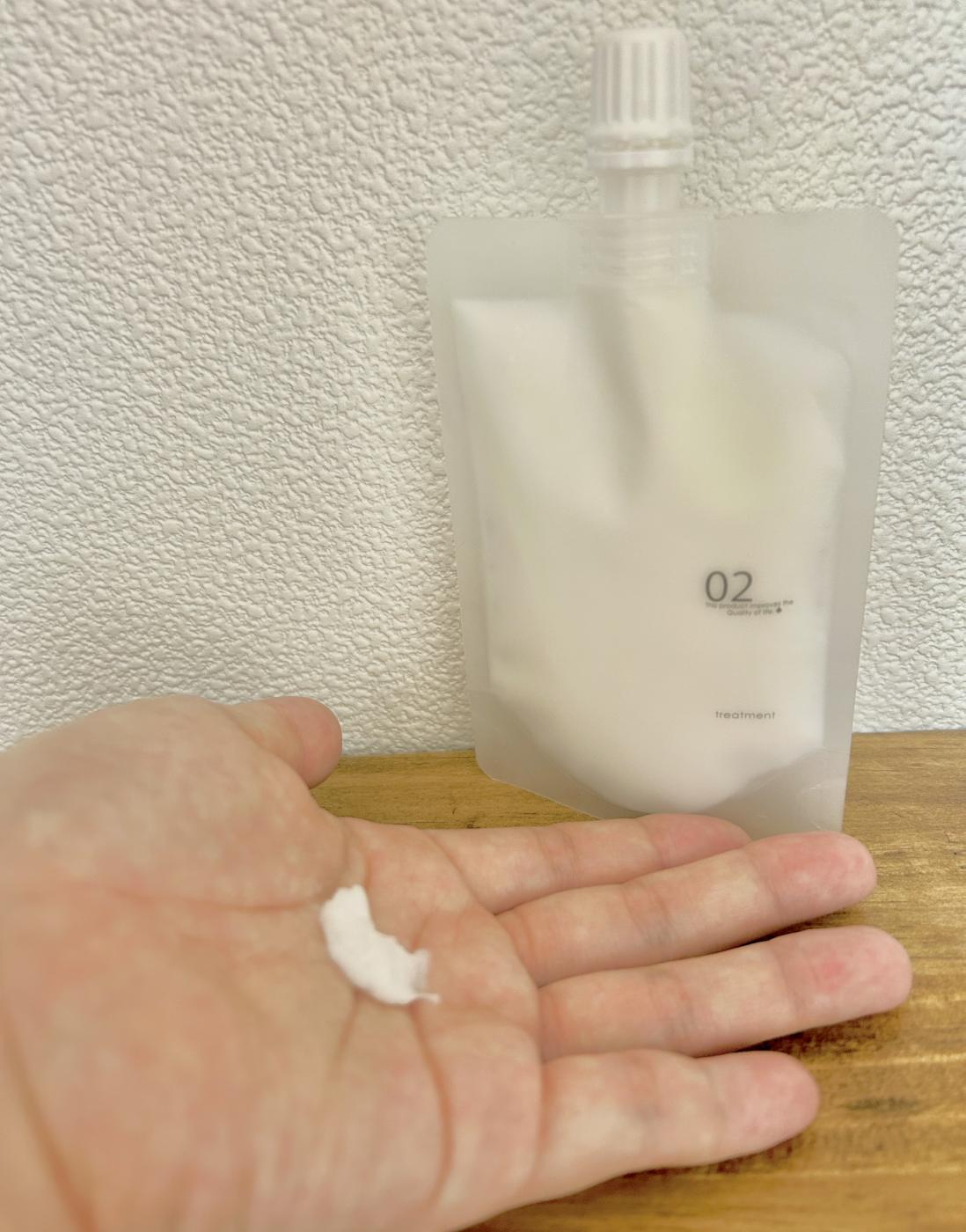 トリートメントは固めのこっくりテクスチャ。手のひらでよく馴染ませてから塗布すると均一に伸び、流した直後からつるつる感をはっきり感じました。