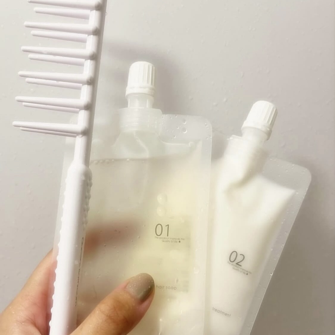 パウチに入ったそれぞれ約5回分のシャンプーとトリートメント、インバスウェットコームがセットになっています。