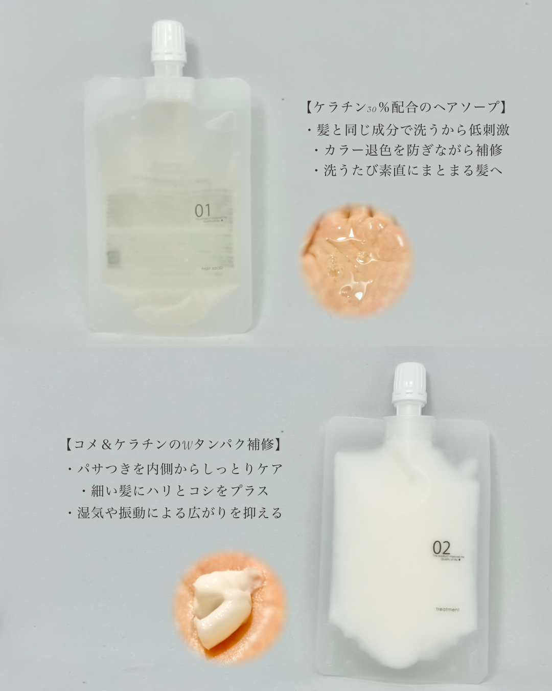 まずヘアソープは、泡立てて少し置いてから流すと、ドライ後の髪のまとまり方が変わりました。ケラチンがしっかり配合されているからか、使い続けるうちに指通りがなめらかになり、カラーの退色も抑えられているように感じます。