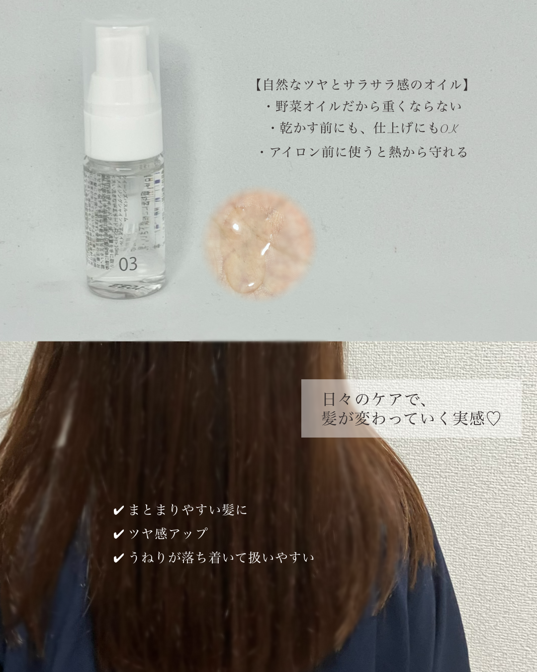 仕上げのアメイジングシャインヘアオイルは、重くならないのにツヤが自然に出るのが気に入りました。乾かす前にも使えますし、アイロン前につけると髪が熱でパサつきにくく、仕上がりが長持ちするのも嬉しいポイントです。