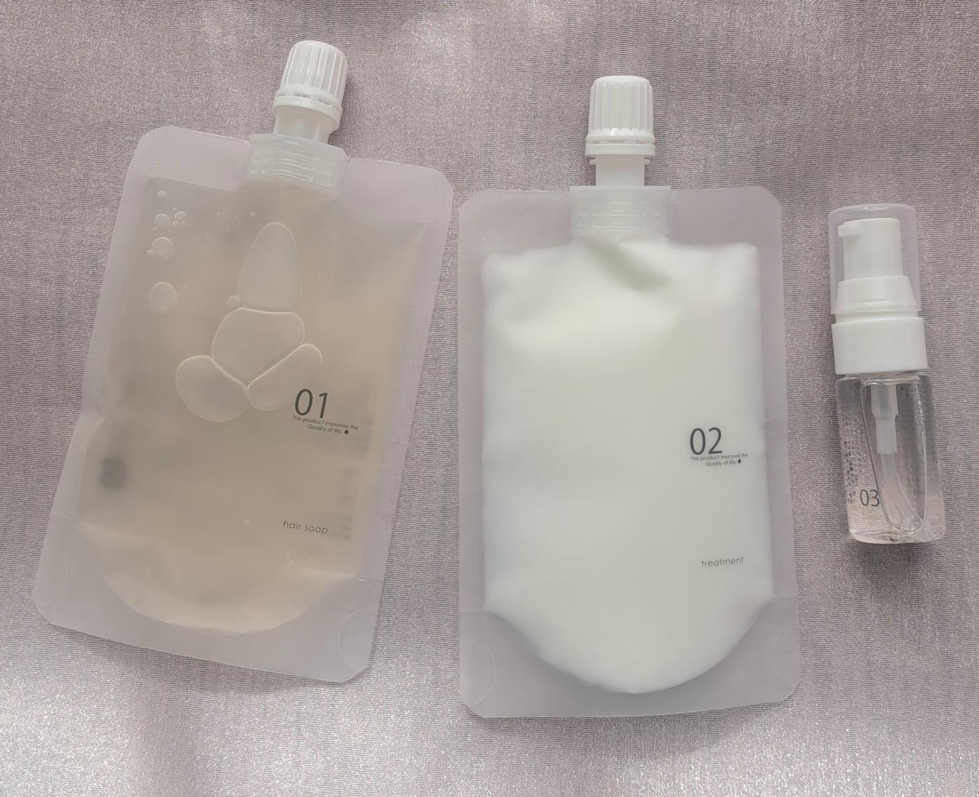 ヘアソープ50mL×トリートメント50g×ヘアオイルサンプル10mLの3点セットです。