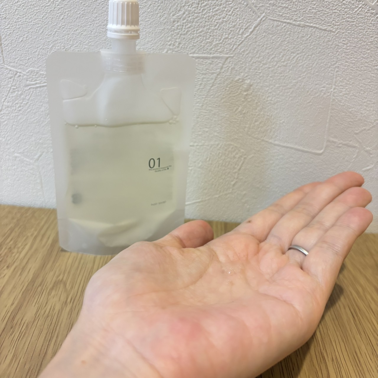 実際に使ってみると、まずシャンプーはテクスチャーがやや硬めで、指に取るともちっとした感触があります🧴