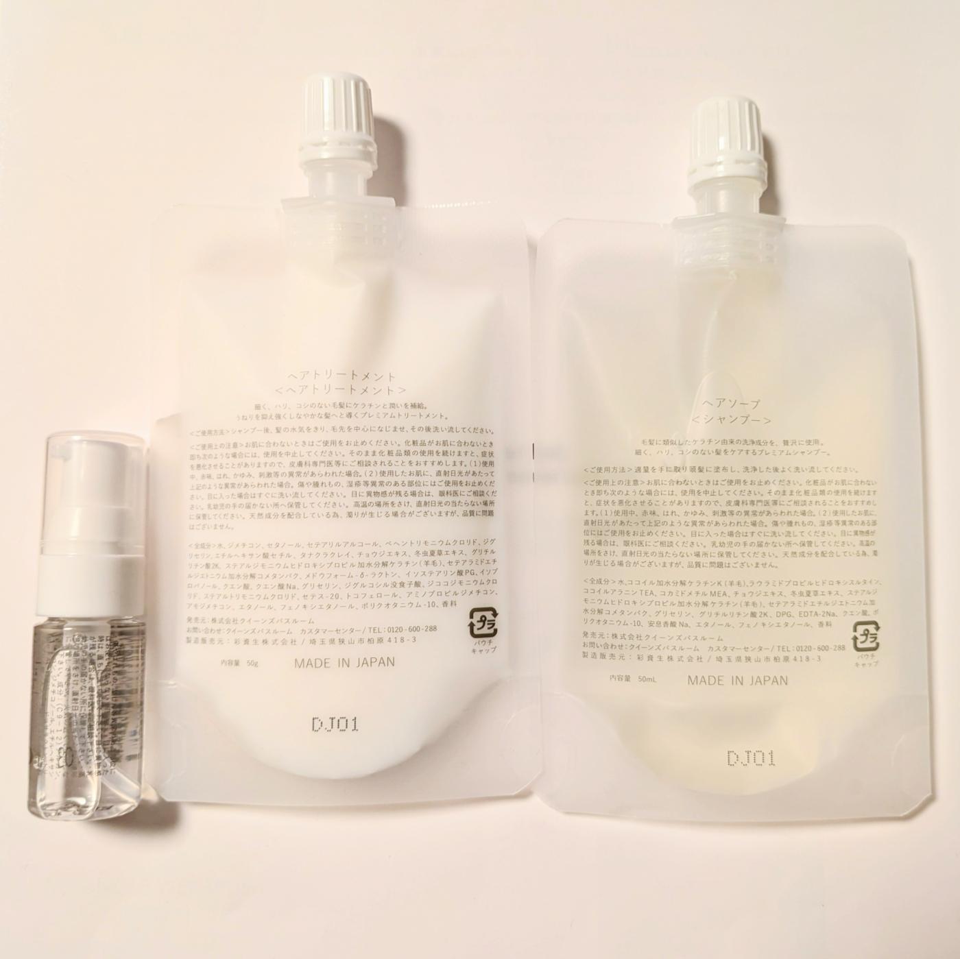 今回お試しさせていただいたのは、5回分セットのパウチタイプのヘアソープとトリートメント、洗い流さないヘアオイルのアメイジングシャインヘアオイルです。