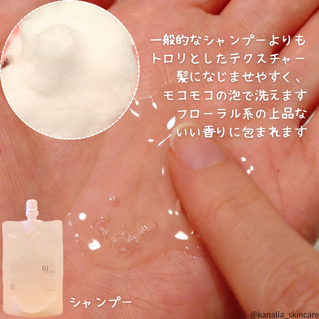 シャンプーは、一般的なシャンプーよりもサラリとしたテクスチャーで、ふわふわの泡立ち🫧
