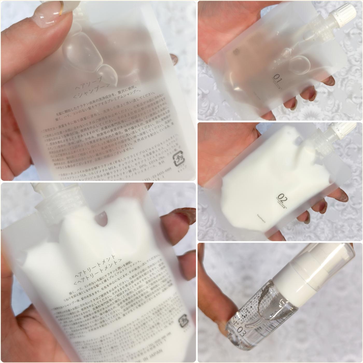 ヘアソープは、ほんのりとろみのあるテクスチャーで泡立ちがいい。少量でも泡立ちがいいからたっぷり泡で毛先まで泡がいきわたるように洗える使い心地。