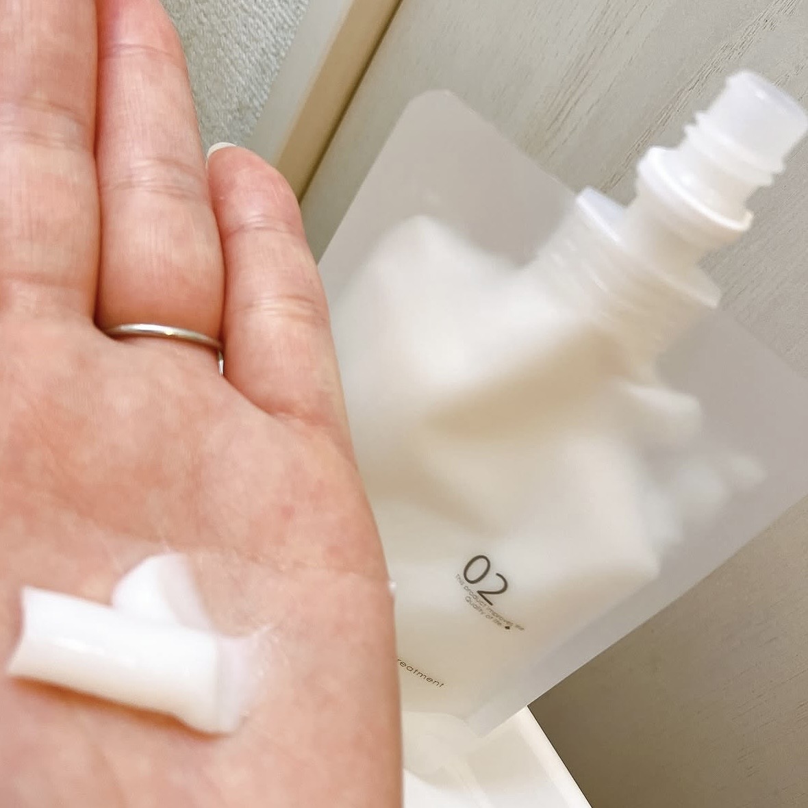 トリートメントはこっくりとしたテクスチャーで、髪にしっかり密着するタイプ。毛先中心になじませると、パサつきやすい部分を包み込むような感覚がありました。