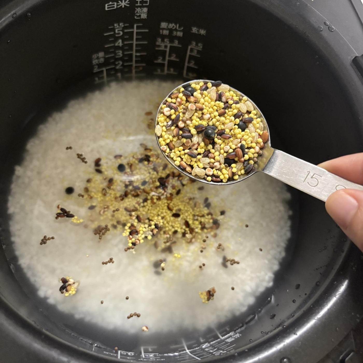 こちらの雑穀はそのまま使えるタイプなので、白米を研いだ後に一緒に入れて、いつも通りに炊飯すればOKです👍