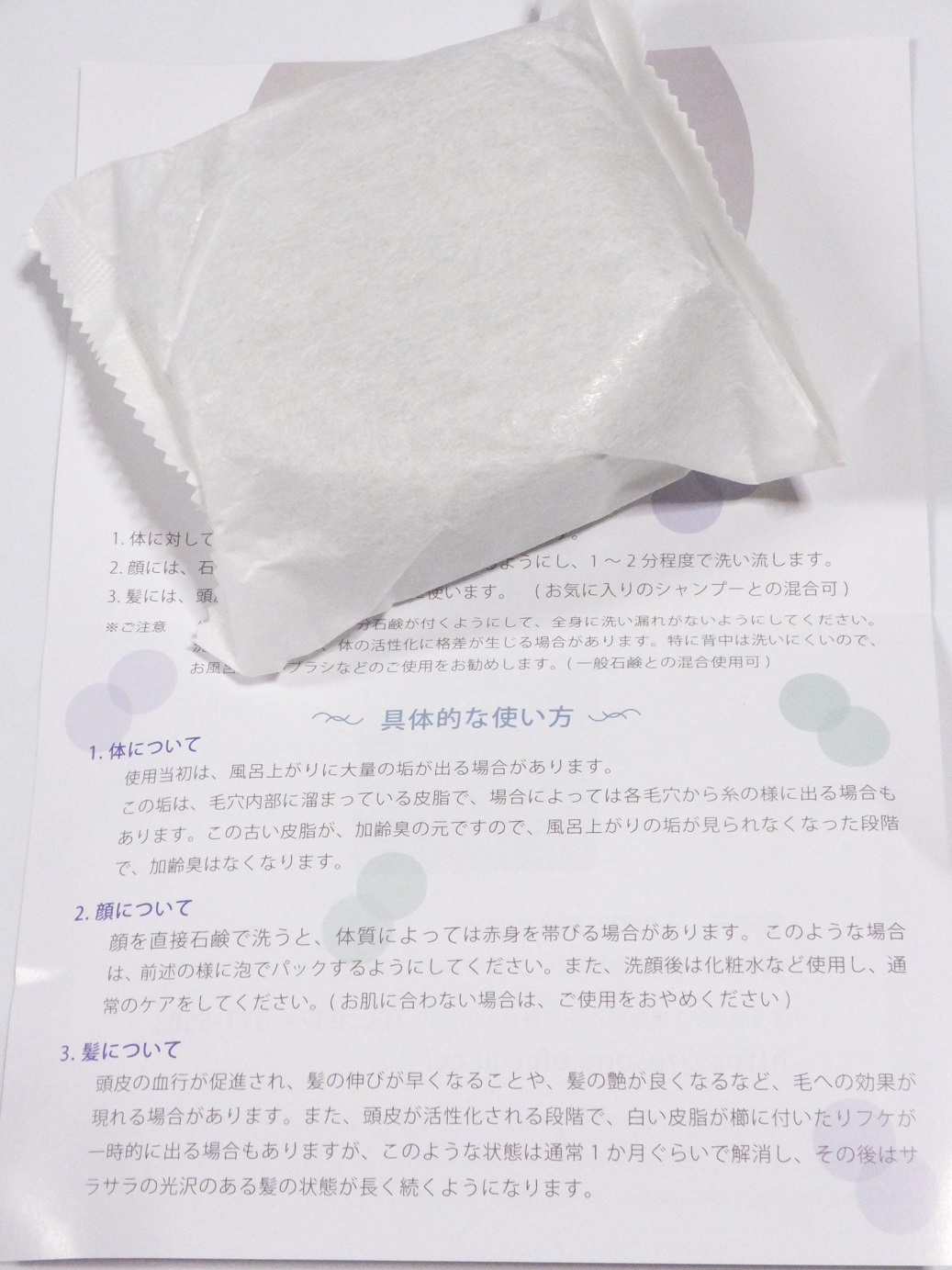 体は固定石鹸をそのままゴシゴシ全身に、泡立ちはいまいちという印象