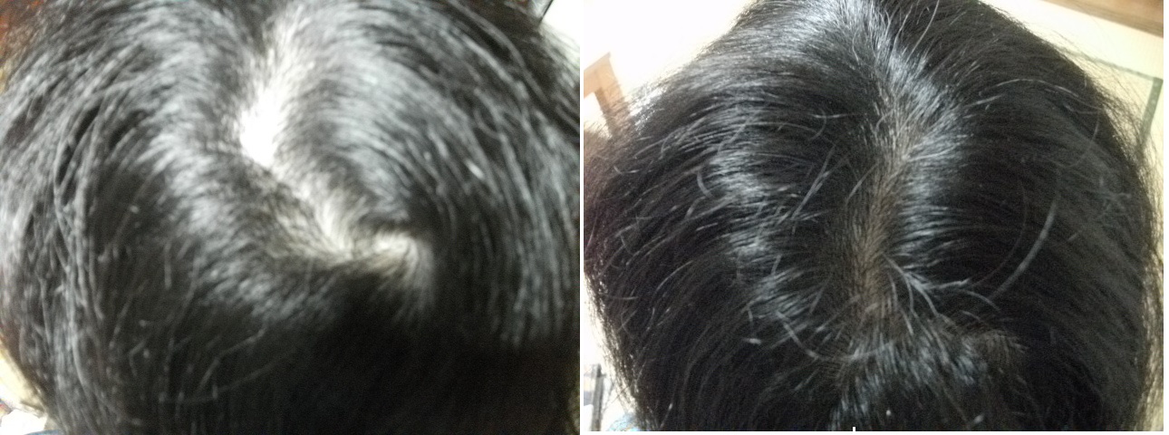 比較してビックリです。頭頂部が薄かったのに、4週間後には薄さが目に見えて分かるほど軽くなっています。髪の量が全体的に増えている事にも驚きを感じました。