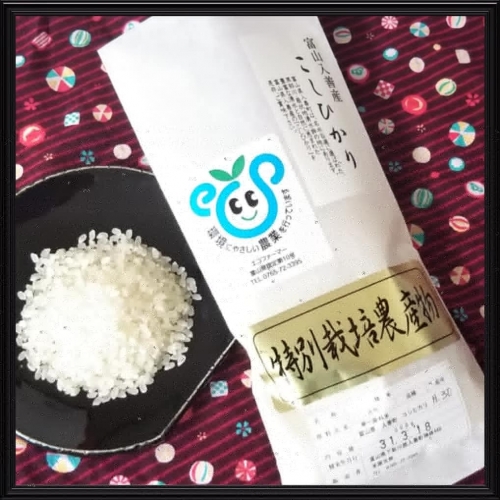 富山県産特別栽培米こしひかり 白米ですが、農薬や化学肥料を極力抑えて栽培したお米で「家族のアレルギーやアトピーのために、よいものを食べたい」という考えで、農薬や化学肥料は極力抑えて、栽培されているというこだわりの感じられるお米です。