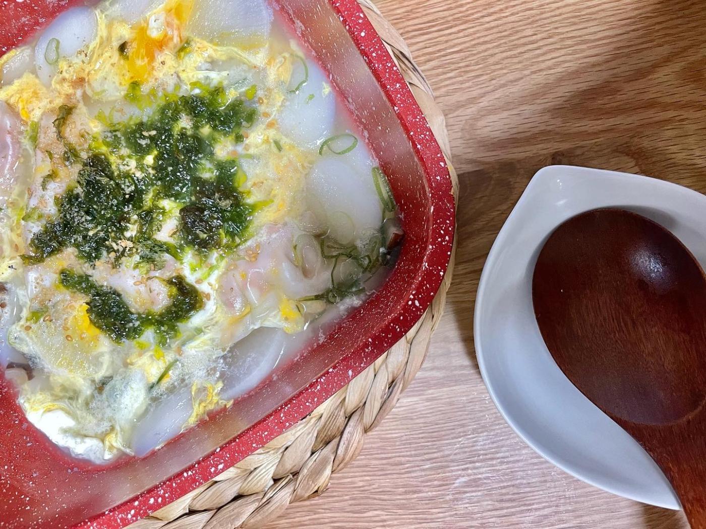 トックスープは、のりと卵をトッピング。のりは八丈島海苔っていうちょっと珍しい海苔のせちゃったけど、磯の香りが追加され、さらに美味しくなりましたよ💕おもちがたーくさんはいっているのでボリューム満点!子どもたちもからくないので食べられました。餃子も入っていて、それはキムチ味。ぴりっと辛くてスープの中でほぐすと味変します!子供には辛いので、子供用に普通の餃子をいれてあげるといいかも💕すっごくおいしかった💕