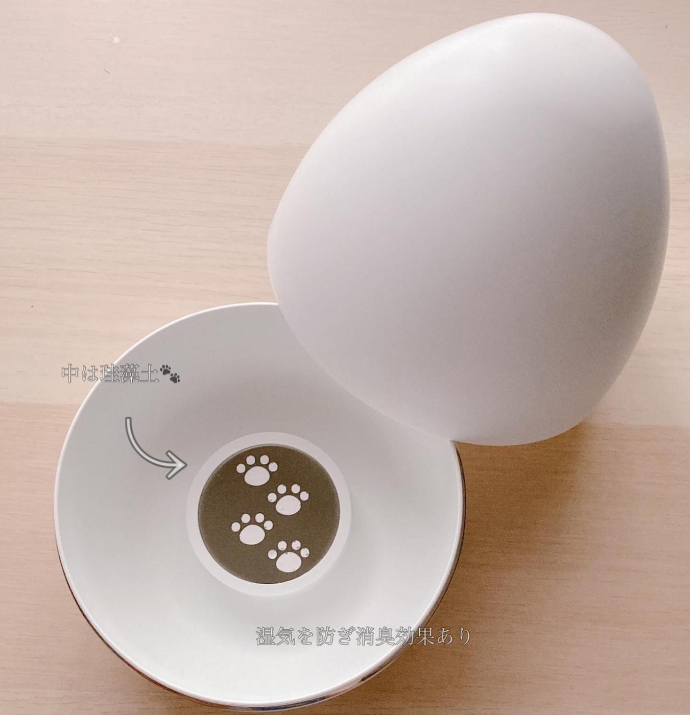 卵の内側には円形の肉球デザインの珪藻土になっていて湿気を防ぎ、消臭効果があるそうです。
