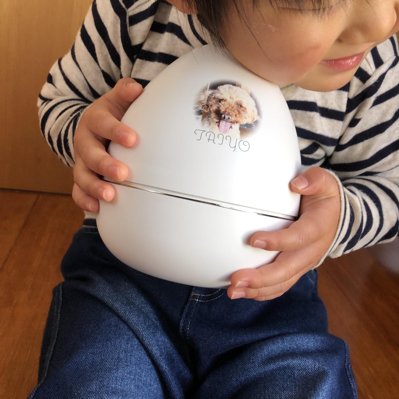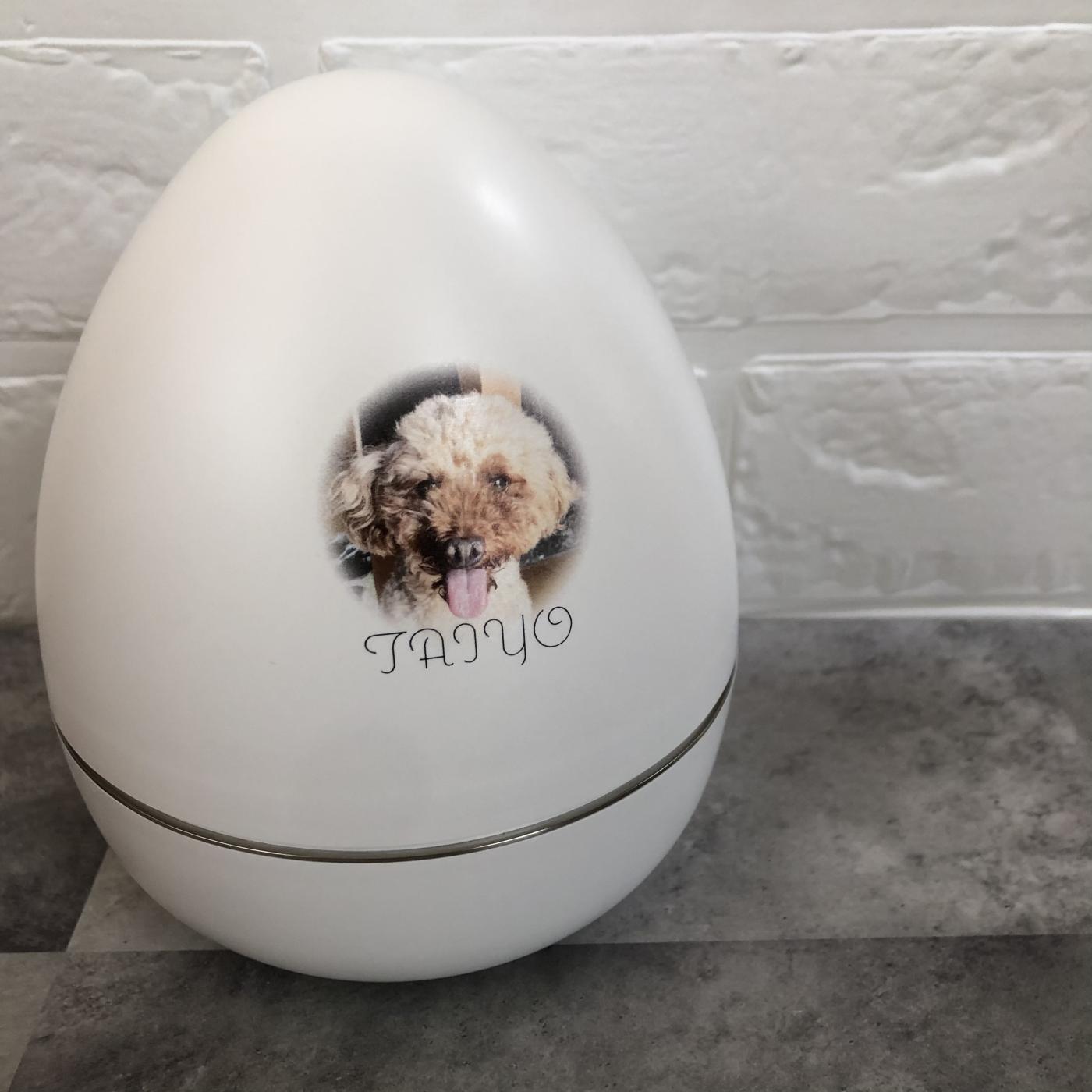 とても軽くてコロンとした卵形のお墓で、写真と名前入りです。