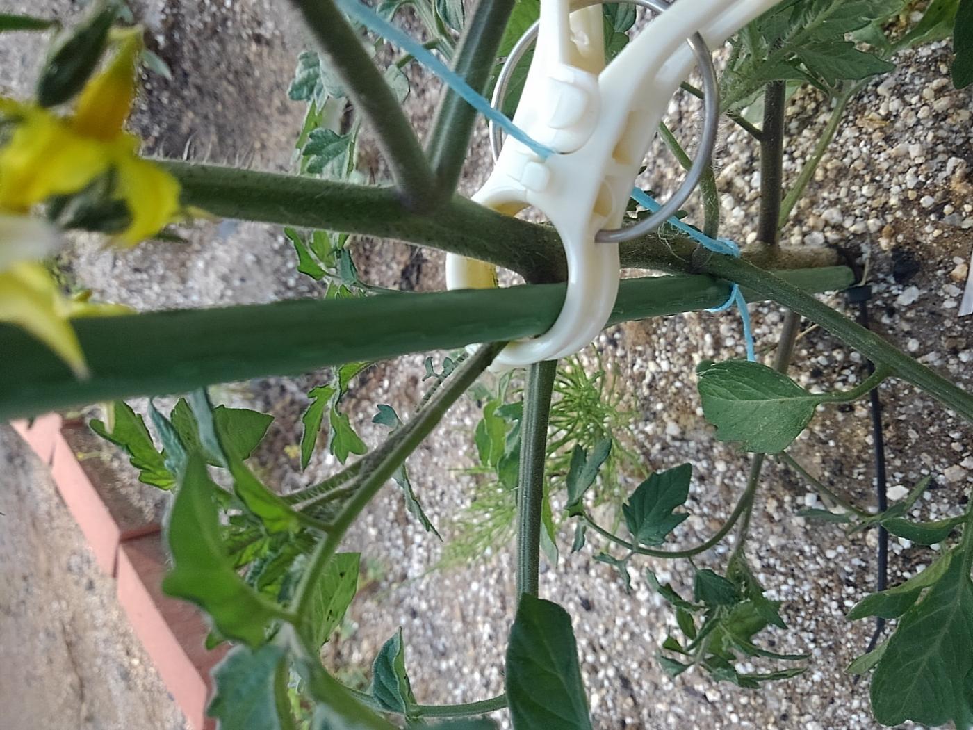トマトがまだ実っていない段階でも茎と柱をクリップで挟んで