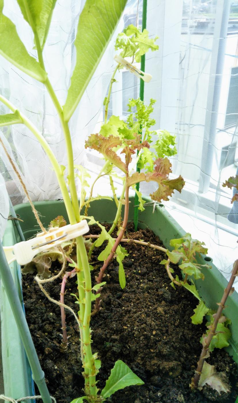 サラダ菜も育てているのですが、下の葉から収穫するのでどうしても頭でっかちになり倒れてかけていたので誘引クリップ結を使用してみました。
