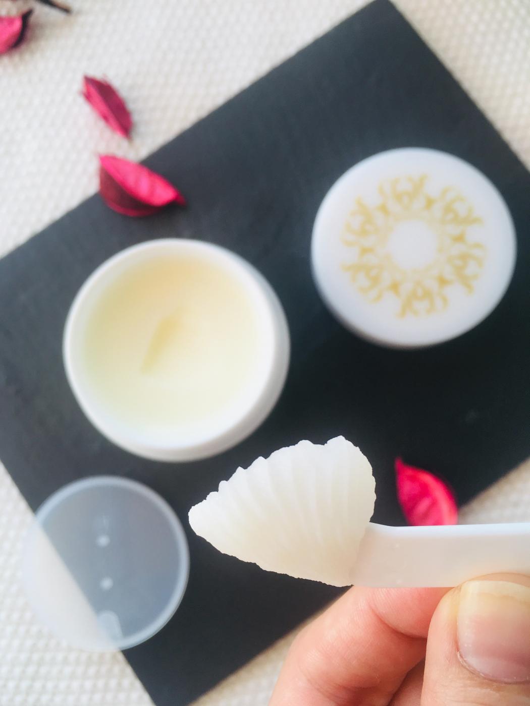 固形のバームを肌の上に乗せると、体温でクリーム状に変化します。