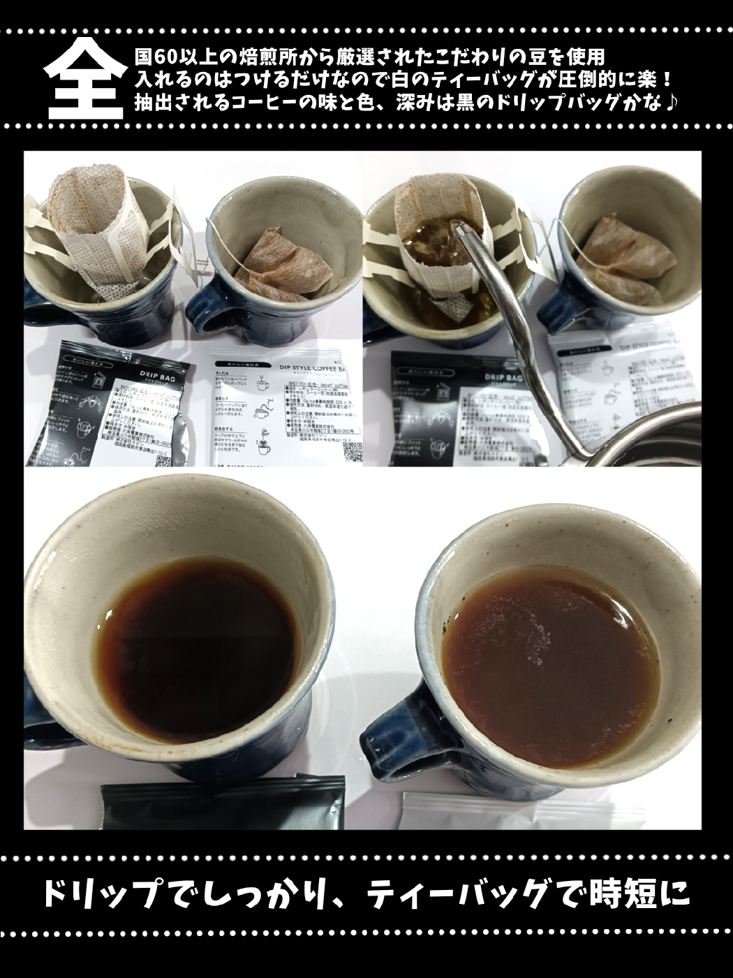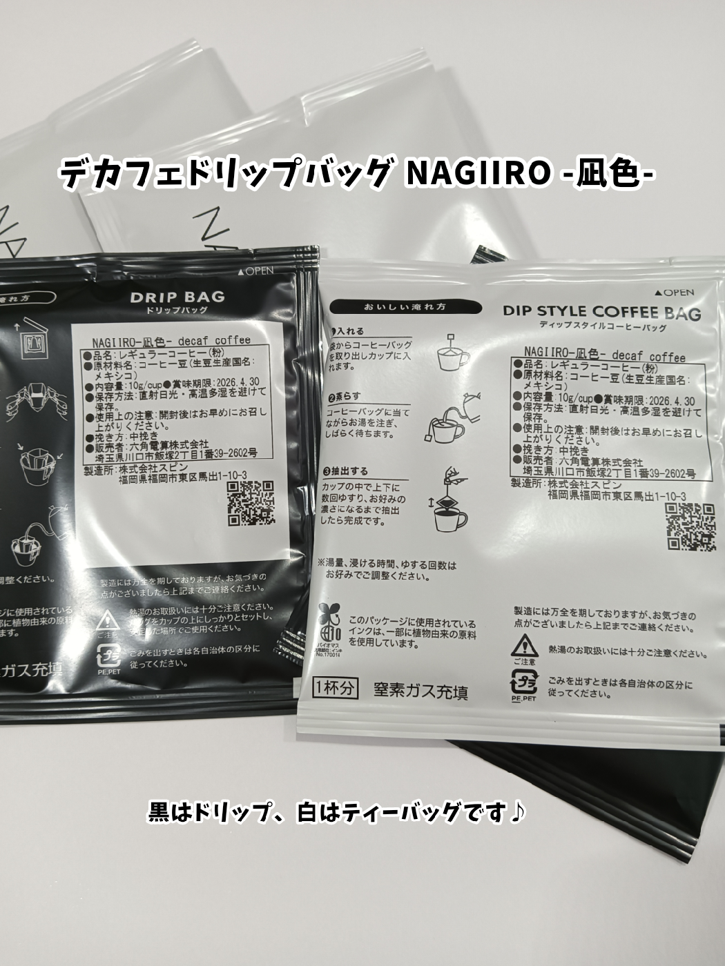 白と黒のパッケージがあって白は大きめのティーバッグ、黒はドリップバッグです!