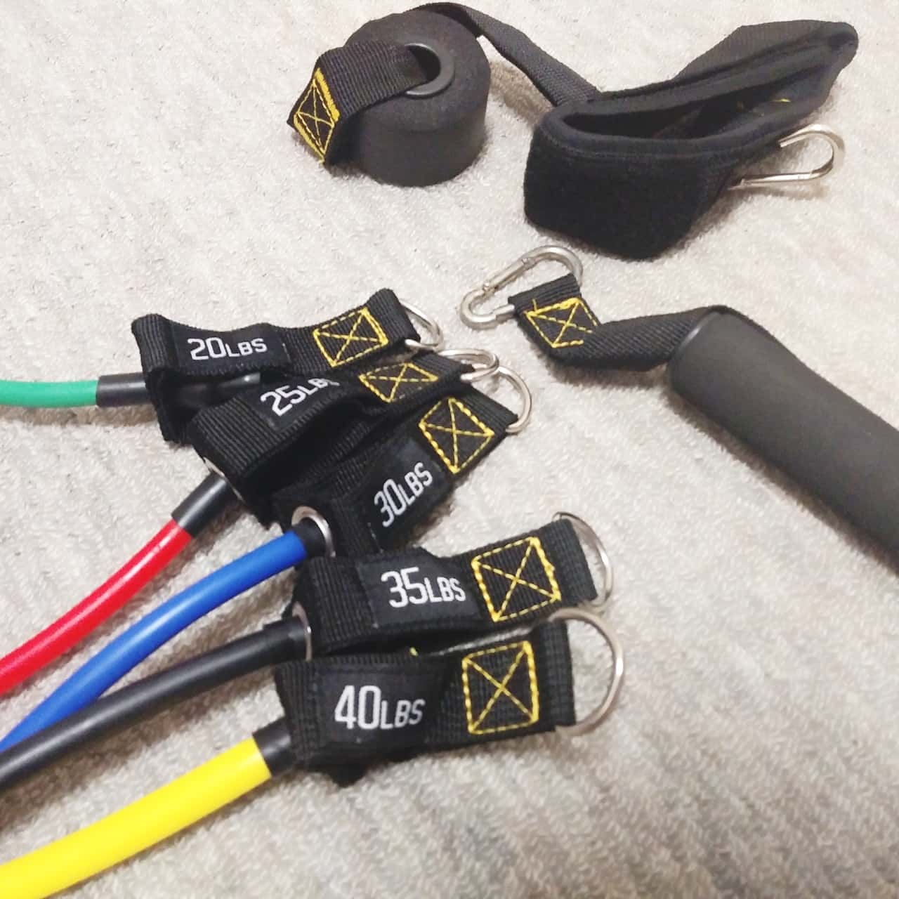 強さの違うトレーニングチューブ×5本とグリップハンドル×2、アンクルストラップ×2、ドアアンカーがセットになっています。