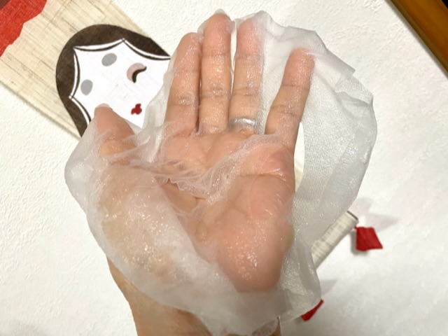 さらに、シートマスクを取り出した後の袋の中にも手のひらから溢れるほどたっぷりの美容液が残っているので、パック後に美容液をさらに顔に重ねたり、首やデコルテ、腕、脚にも塗布したり、たっぷり贅沢にお手入れできるのが魅力的です😃