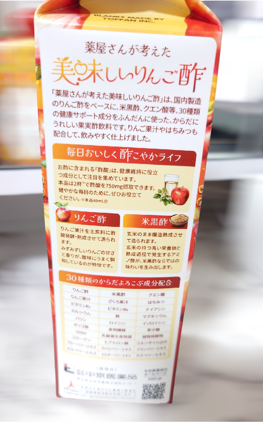 国産のりんごをベースに、米黒酢・クエン酸・ビタミンB2 B6・コラーゲン等、30種類の健康サポート成分をふんだんに使った、からだにうれしい『リンゴ果実酢飲料』