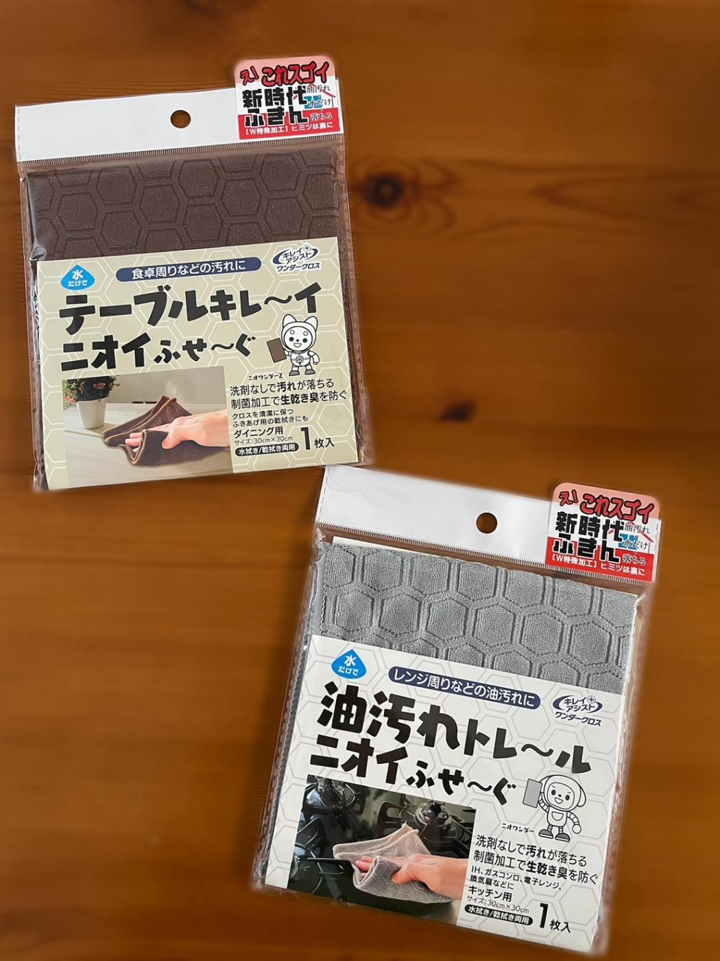 ブラウンをテーブル用、グレーをキッチンなどの油汚れ用にしています。