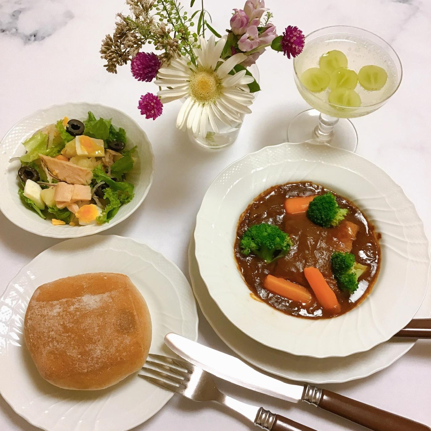 茹でたブロッコリーと人参を加えて、サラダとパンを用意すれば、